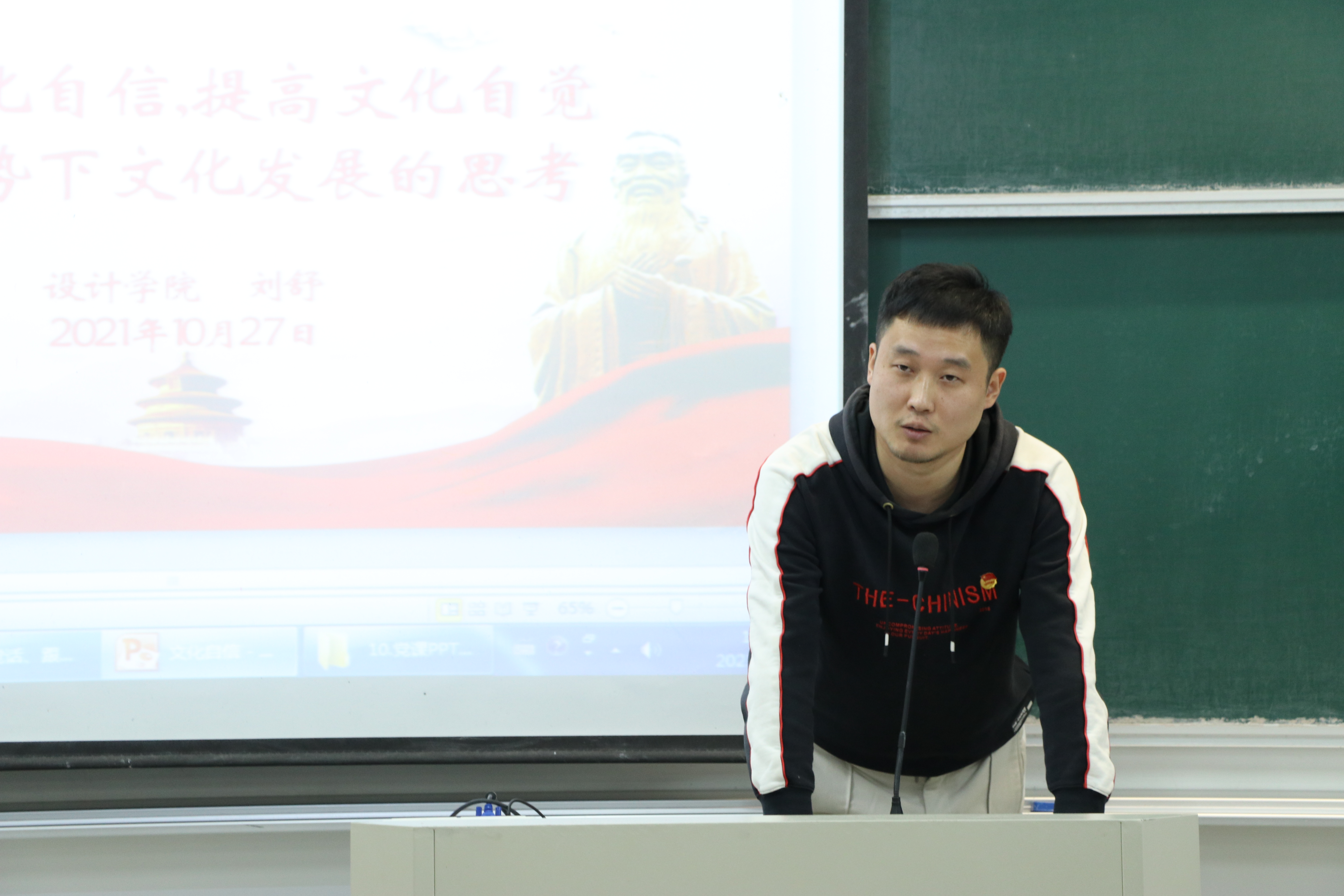 建筑学员工党支部书记刘舒老师以“增强文化自信,提高文化自觉”为主题,与员工党员们深入探讨了文化自信的底气来源与文化自信的重要意义,他希望员工党员们要提升文化软实力,包容借鉴外来文化的精妙之处,弘扬发展中华文化所具有的独特魅力,立足国本又面向世界,以此来提高我国文化“走出去”的能力。