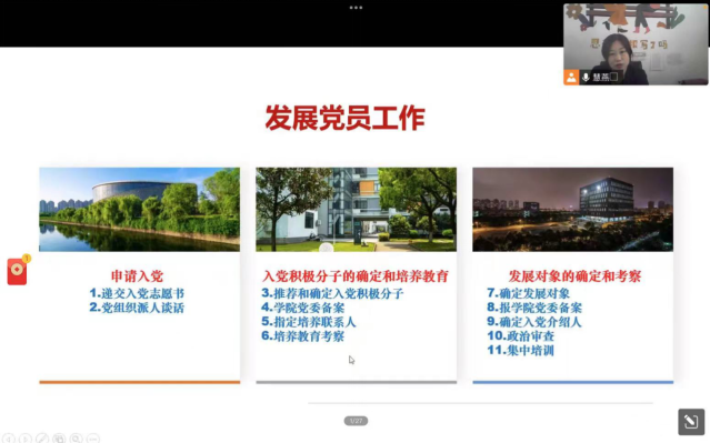 金慧燕首先介绍了党支部工作流程和主要工作内容,强调了党支部的职责和使命,使同学们对党支部有了更为准确的认识。随后,她从入党申请、入党积极分子的确定和培养、发展对象的确定和考察,到预备党员的接收、考察和转正等入党流程进行了详尽的讲解。“老师,我不是共青团员,能递交入党申请书吗?”“老师,入党要求是员工干部吗?”……大家纷纷留言。针对同学们提出的问题,金慧燕进行了耐心的解答,让同学们对入党有了更加深入的了解和规划。最后,她寄语同学们积极向党组织靠拢,有一份光,发一份热,不忘入党初心,让奋斗成为青春的底色。