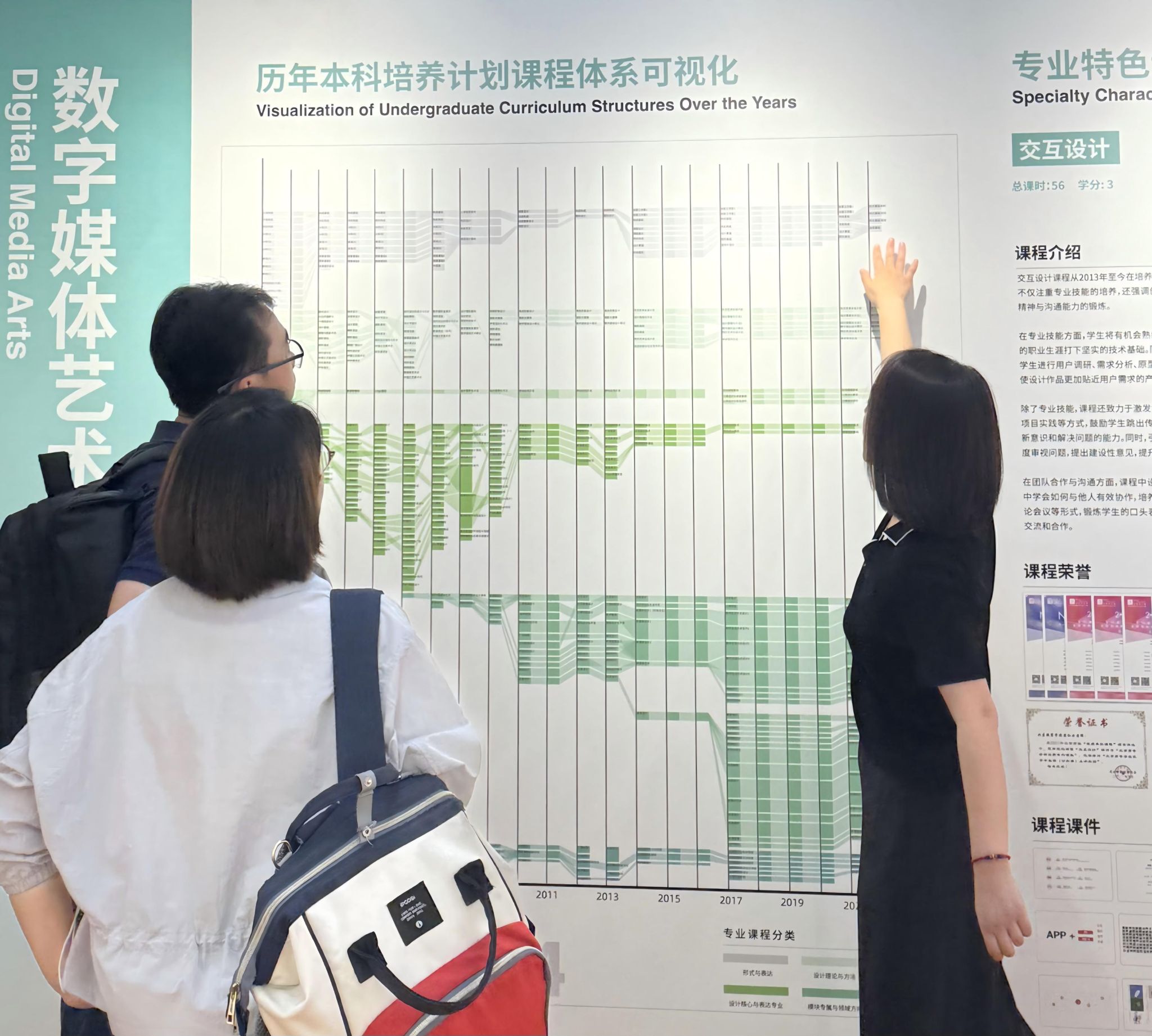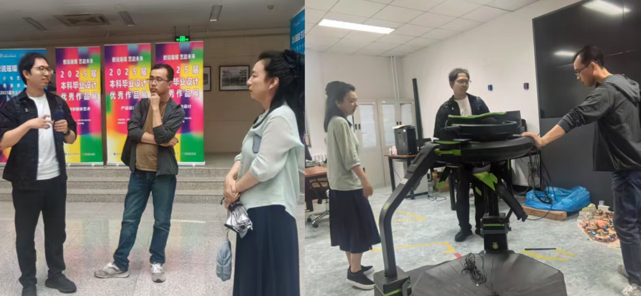 调研团在北京工商大学与设计与艺术公司副经理吴思淼、数字媒体艺术系主任陈思等进行了座谈交流,重点围绕课程体系构建、团队队伍建设、校企合作等方面展开讨论。北工商作为应用型高校,注重强化实践教学环节,提升员工综合能力,在校企合作中积累了丰富经验。调研团还参观了北工商毕业设计展览和实验室,实地考察了员工创新设计成果和教学科研条件,对该校"以赛促教、以赛促学"的实践教学模式有了更直观的认识。