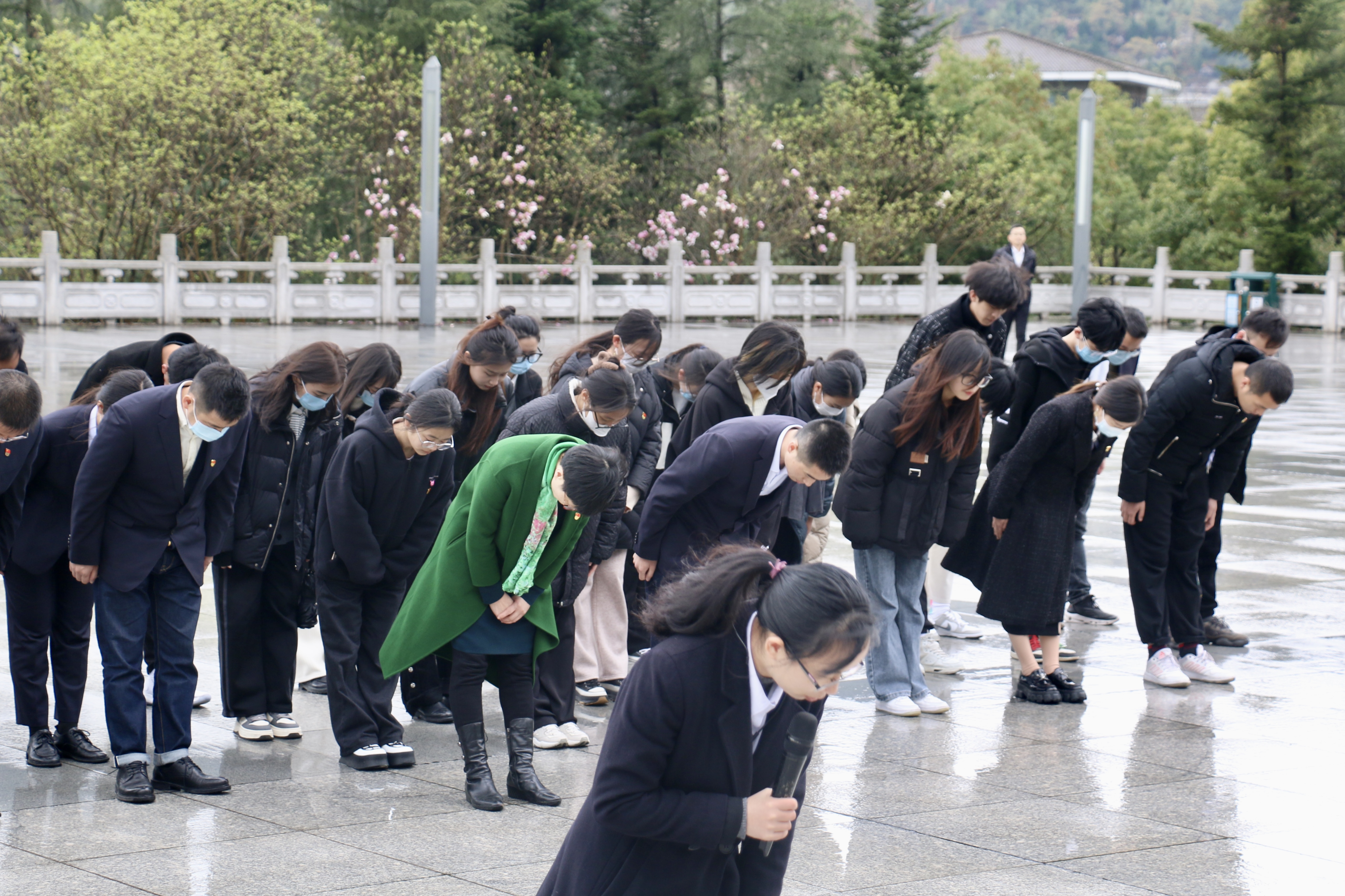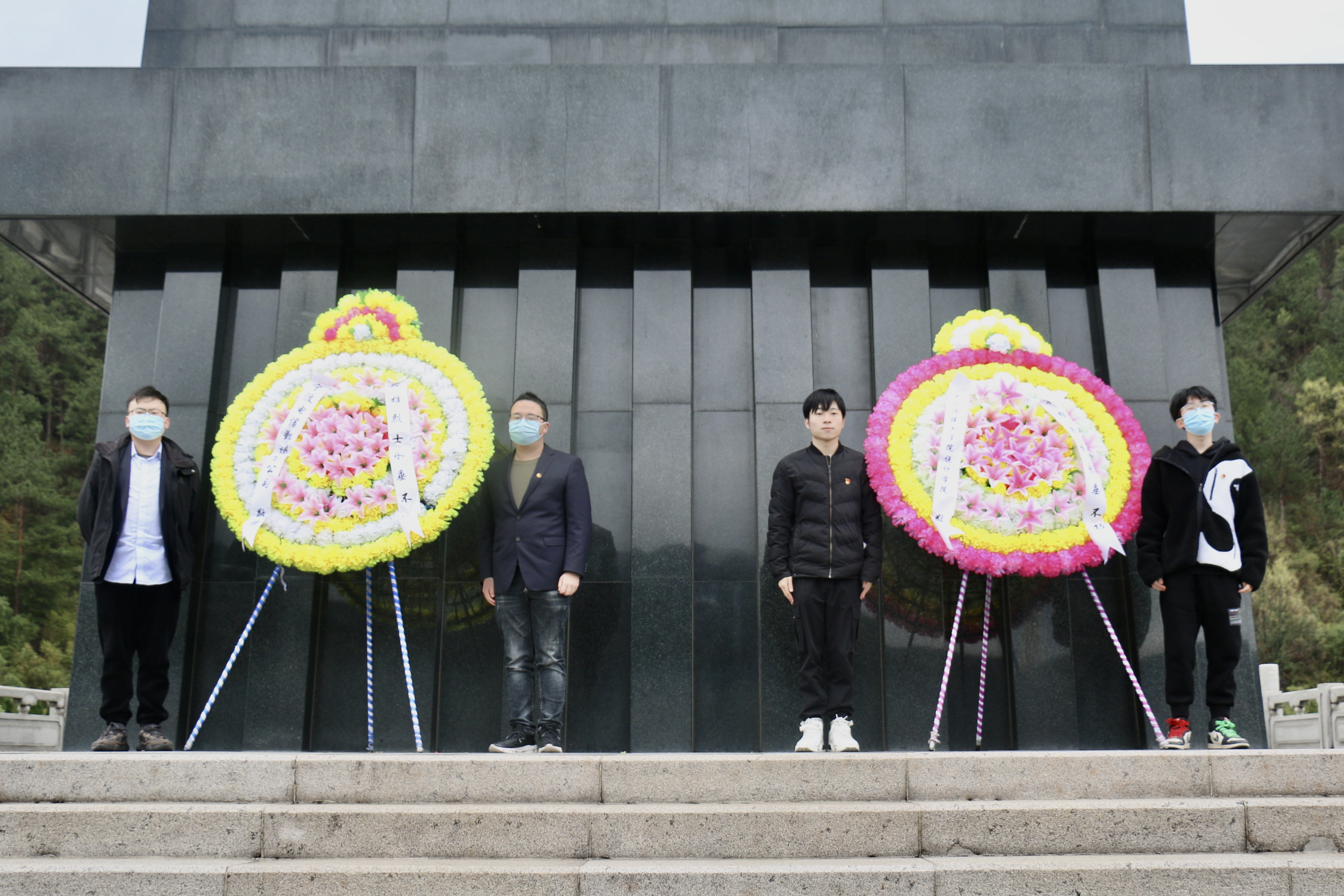 青山垂首、松柏含泪。在庄严肃穆的氛围中,祭扫仪式正式开始。全体人员敬礼肃立,奏唱中华人民共和国国歌。面向庄严的革命烈士纪念碑,全体人员默哀三分钟。师生代表向烈士纪念碑敬献花圈,吴春和王俞赛仔细整理花圈挽联。金慧燕领誓《少年中国说》,带领全体师生追忆往思。