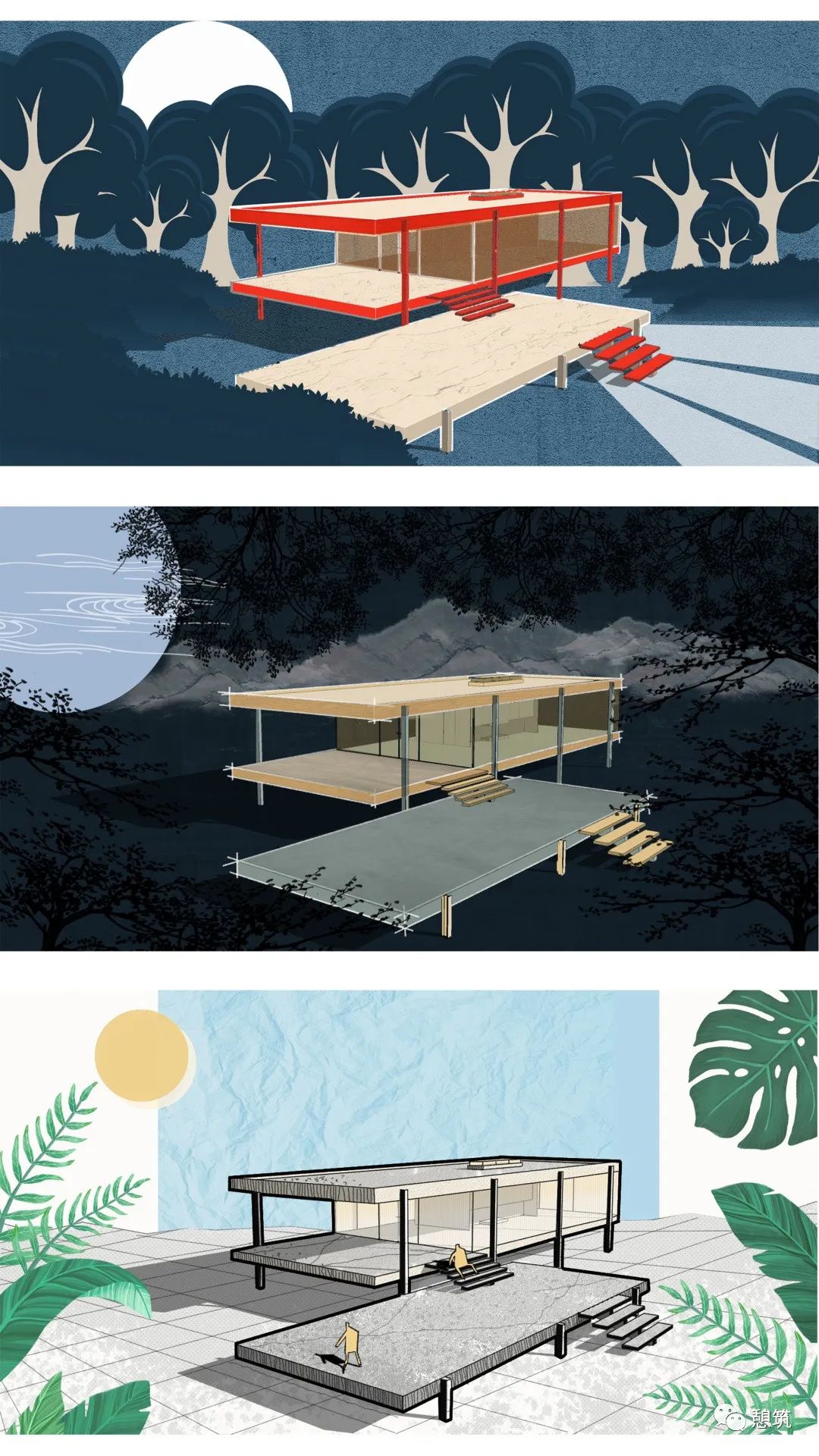 意在通过三种不同的风格来表达不同的氛围和效果,以传达不同的视觉感受,传递对同一建筑的不同理解和体会。