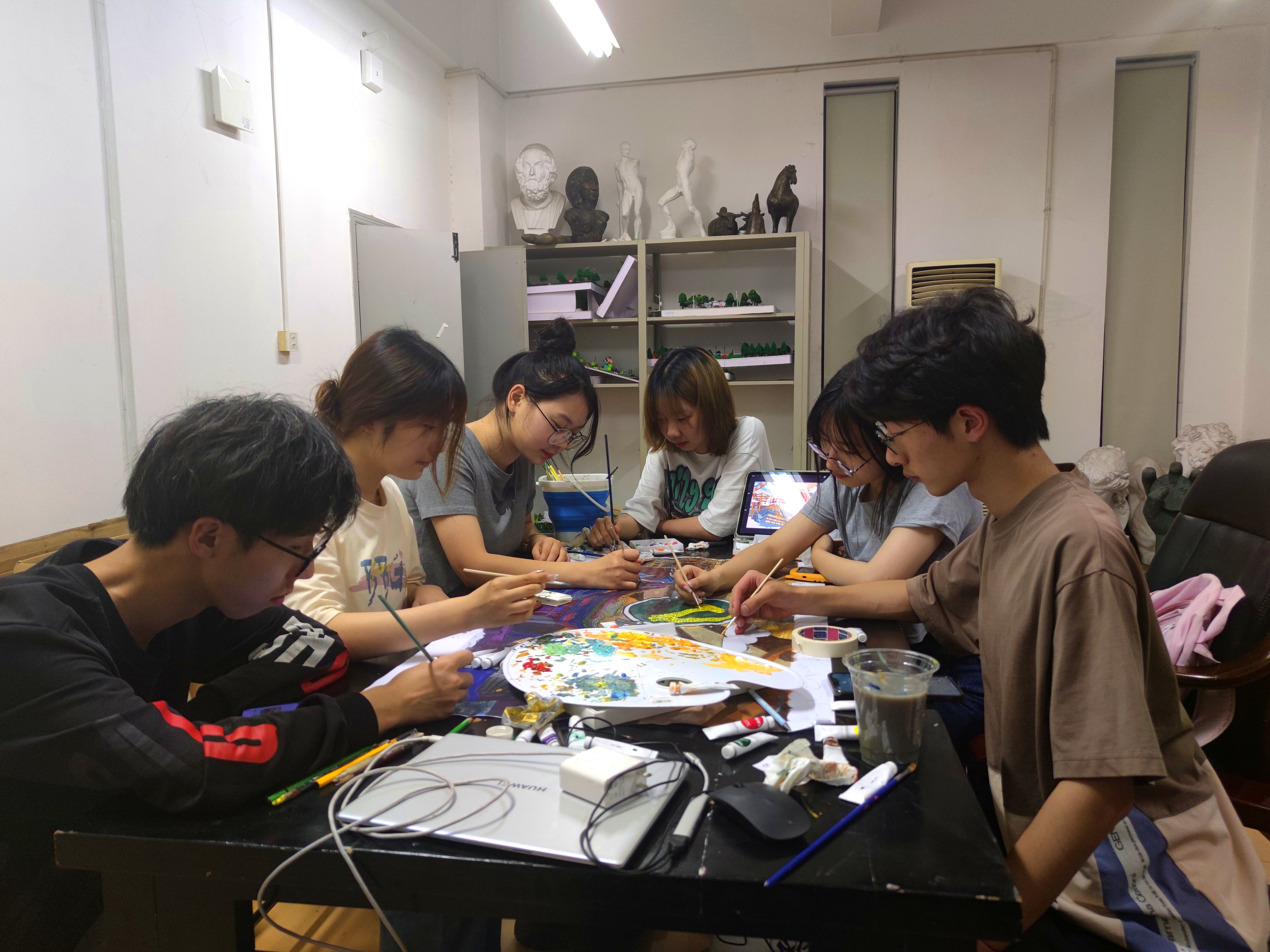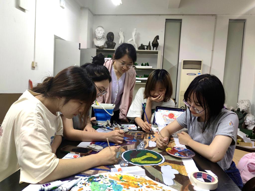 卢锦荣同学说:“虽然过程很艰辛,但是看见它挂上墙给人眼前一亮的感觉,听见周围同学赞叹‘以前没见过这种画法’,‘好有意思啊’时,我的内心是感激与开心的。还记得画画到凌晨1点时,鲁微微老师也陪在我们身边鼓励指导我们,觉得很温暖,也记得同学们都在为这幅画埋头苦干,献出自己力量,觉得都是值得的!”