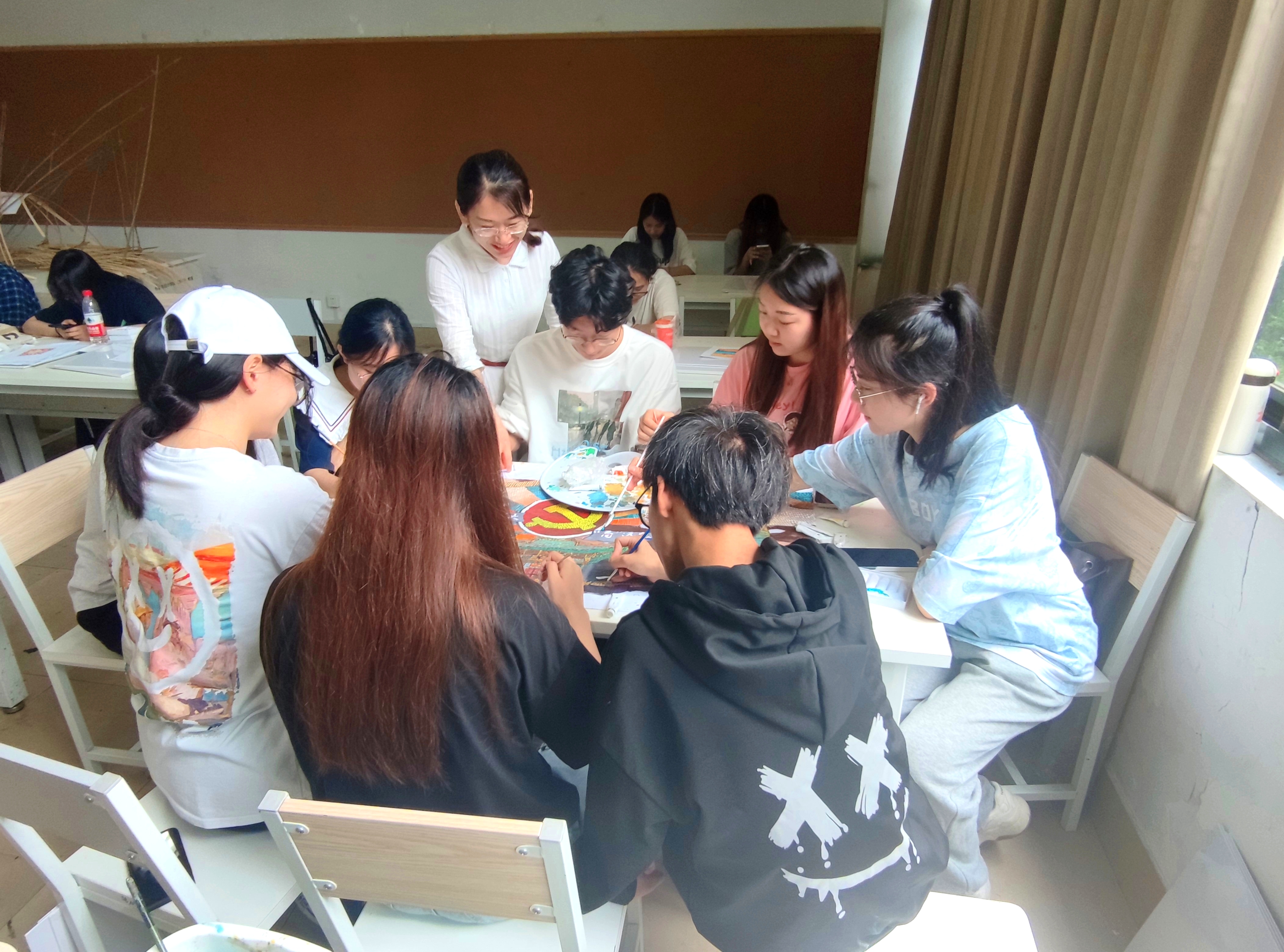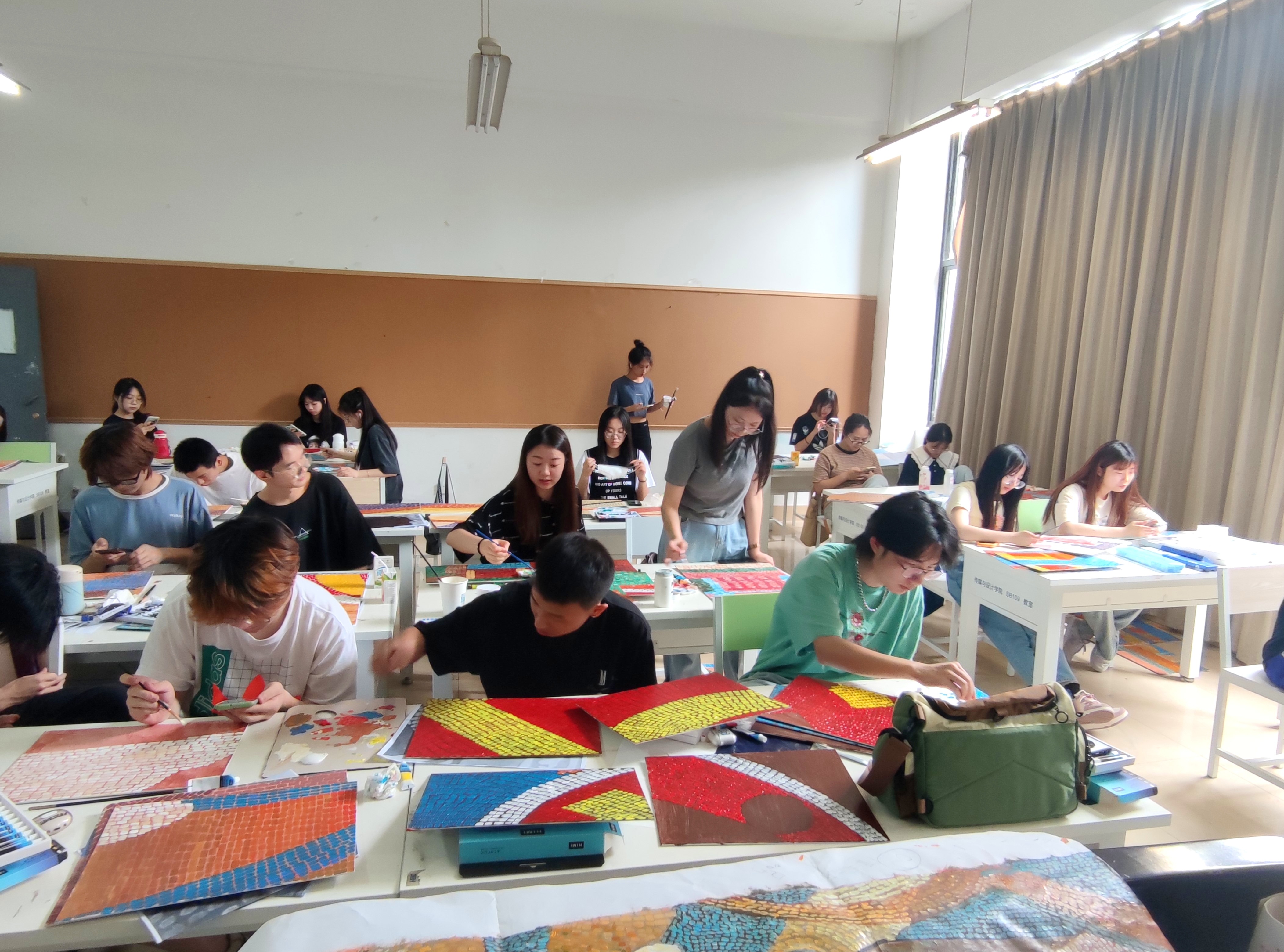 课程中,鲁微微老师指导主题创作,励宇辉老师指导制作工艺。两位老师强调“知行合一”,引导员工思考“怎样运用课程知识于创作中”,“如何创新制作工艺使得画幅大气、美观”。作品在形式上以点成线,将线成面,以块成板,拼板成墙。“纵是尘雾之微,融入整体,亦可补益山海,纵为萤烛末光,融入宏图大业,亦可增辉日月。”鲁微微老师在课堂上鼓励同学们,我们的结课创作分到的板块有繁有简,同学们当知不管在哪一个位置,都要竭尽全力发挥出自己的水平。这考验的不单单是我们的绘画技术,更是班级团结与凝聚力的体现。孤举者难起,众行者亦趋。不论是哪个小板块出了问题,这幅画都将是不协调的,是残缺的!