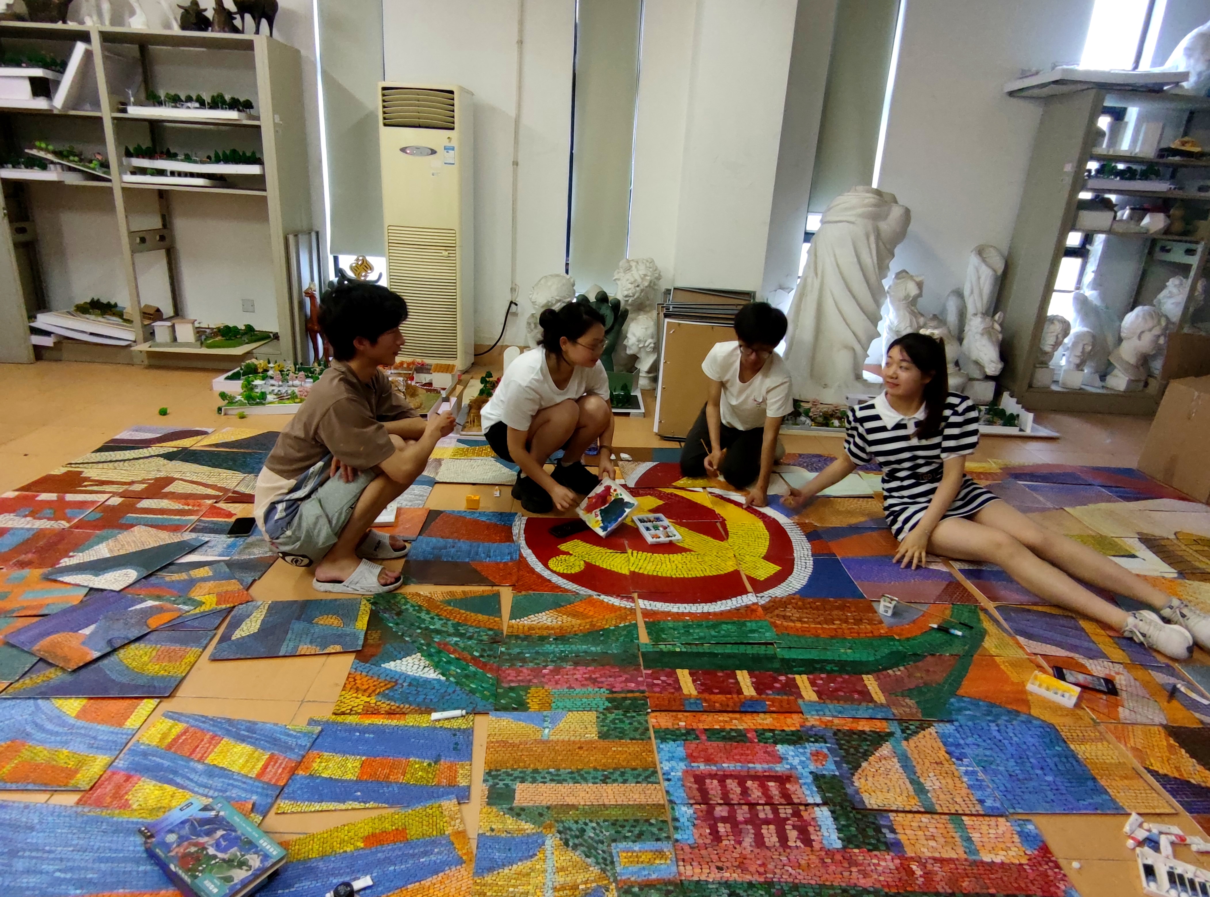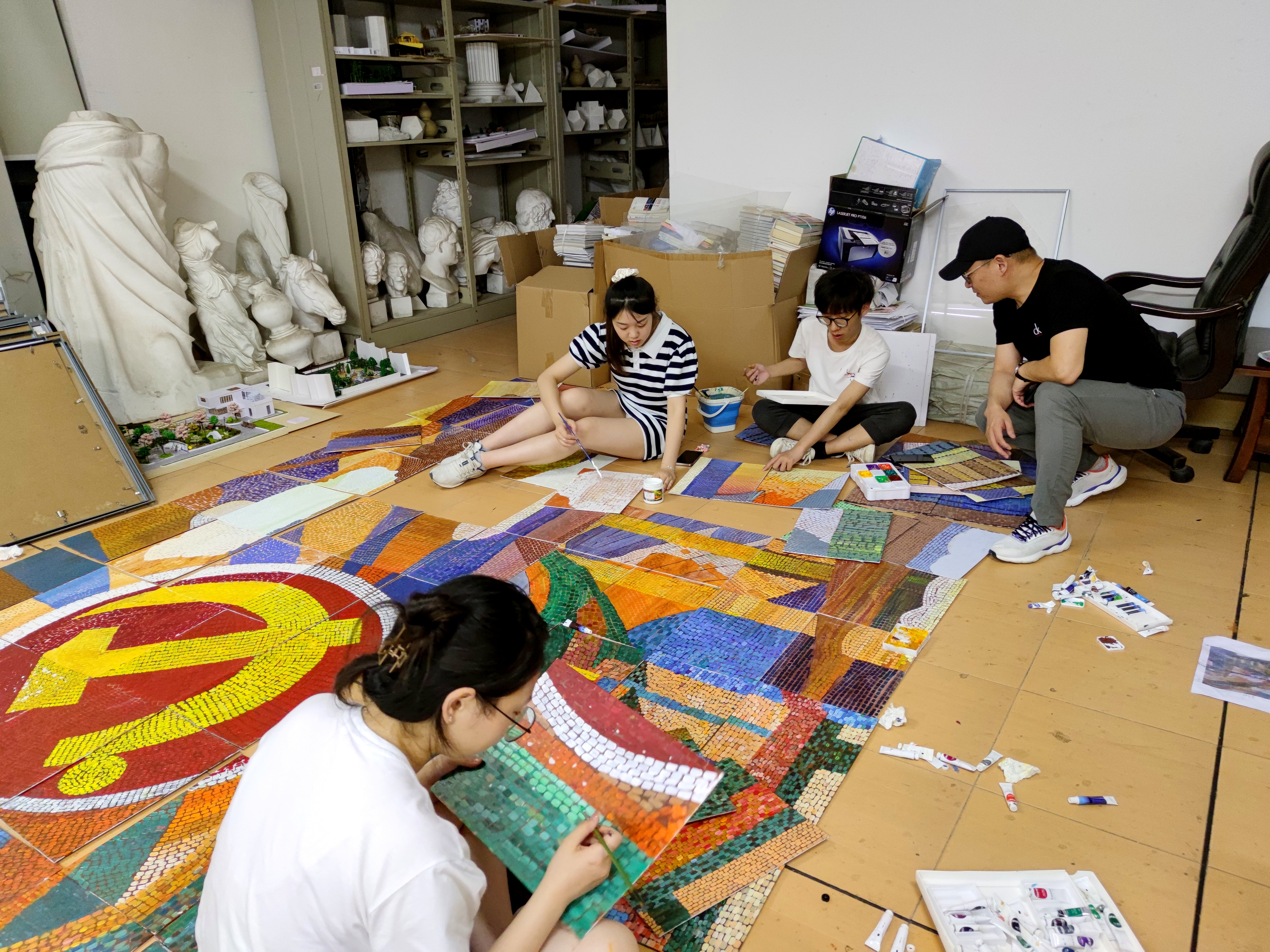 疾风知劲草,烈火见真金。在两位老师的悉心指导下,韩春萍、卢锦荣、吴卓楠、汤一等同学不断精益求精,坚持不懈,前后多次构思作品内容,不断协调画面主体,创新表现手法,反复修改创作,圆满完成了从初稿、电子定稿、手绘稿再到上色范稿的创作。同学们合理分工,沟通协调,从七拼八凑到井井有条,团结一心、互帮互助、不畏困难。环境设计211班的29名同学历经2周时间,用5万多小笔触将117块小画板拼起,完成5.2╳2.7米巨幅画作,当将作品悬挂在SF一楼大厅墙壁上的那一刻,同学们的成就感和幸福感油然而生。