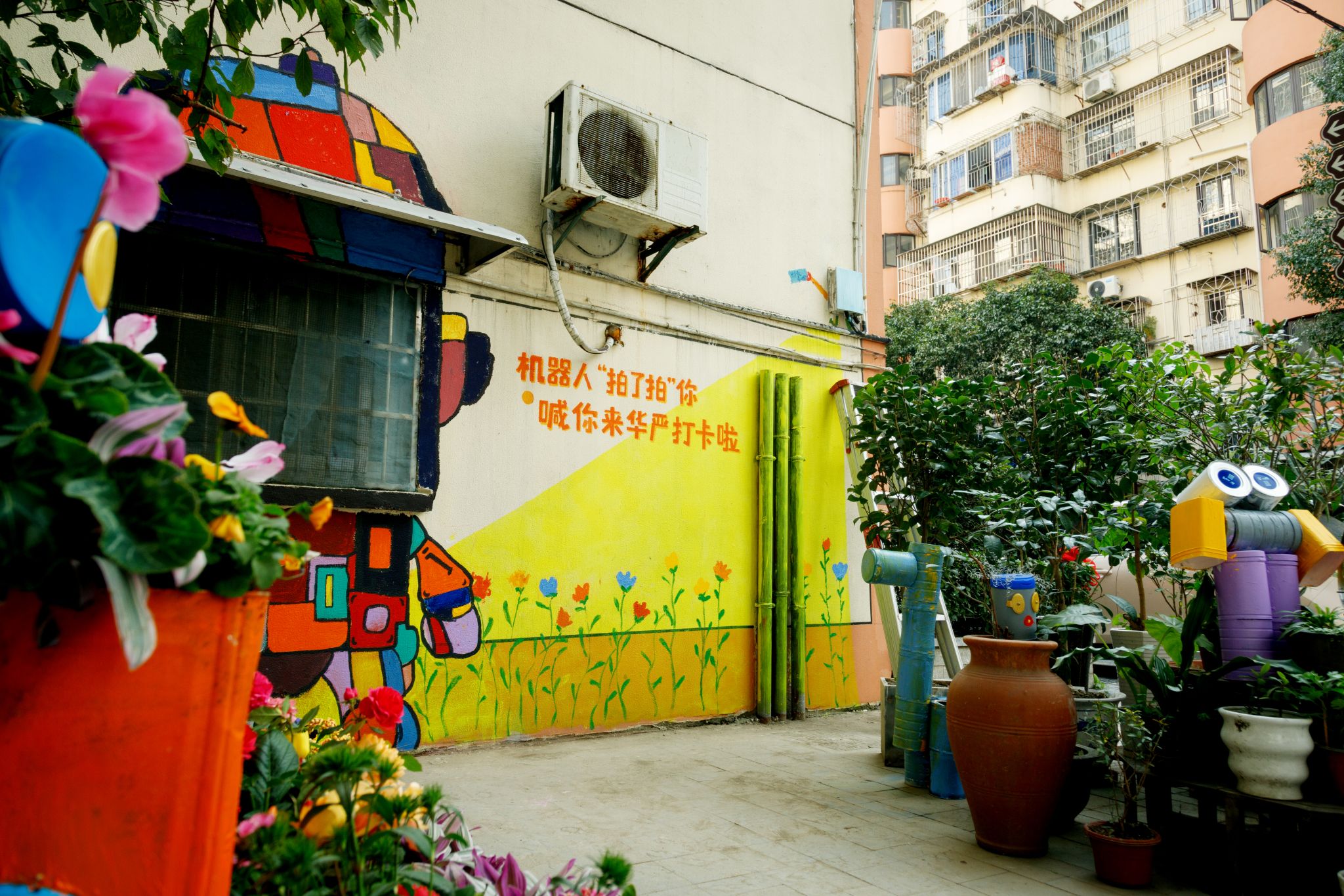 2025年1月2日,设计学子深入华严社区,与四眼契小学的老师和四年级小朋友们共同绘制机器人墙绘,吸引了众多居民驻足观看,此次活动在青年学子和小朋友心中种下了“社区建设,人人有责”的理念。墙绘组成员梁诗涵和胡佳颖同学说:“看到社区居民路过时脸上洋溢的笑容,我觉得我们所做的不仅仅是美化了一面墙,更是在传递正能量和社区的温暖。希望这样的课程活动能越来越多,让更多人参与到社区建设中来。”经过同学们的努力,华严社区花园的更新改造工作于1月3日顺利完成。原本平淡无奇的社区转角变成了五彩斑斓的机器人主题花园,充满童趣与科技感的奶粉罐机器人成为装点社区的别样景致,成为了一张社区文化的新名片。