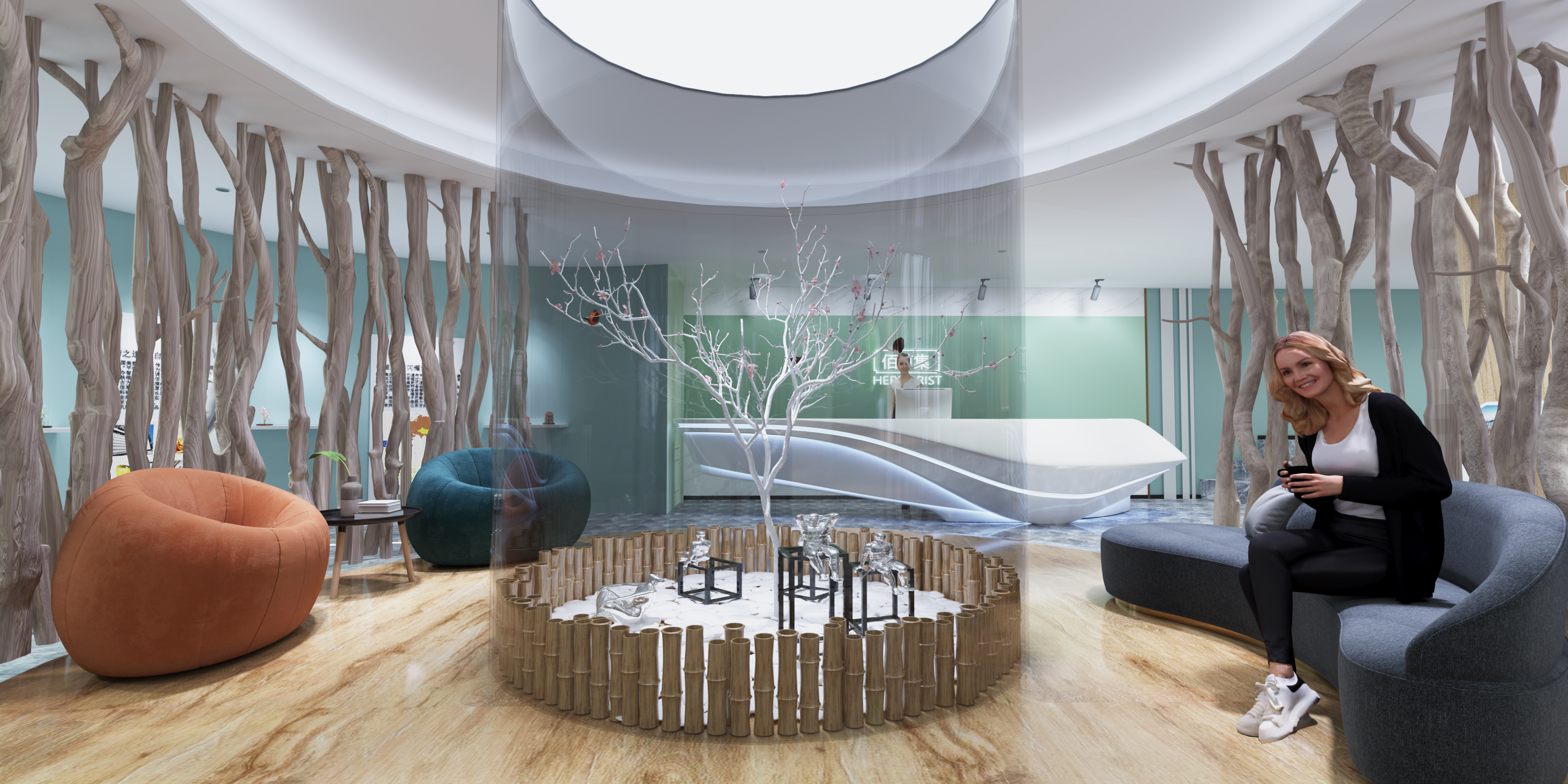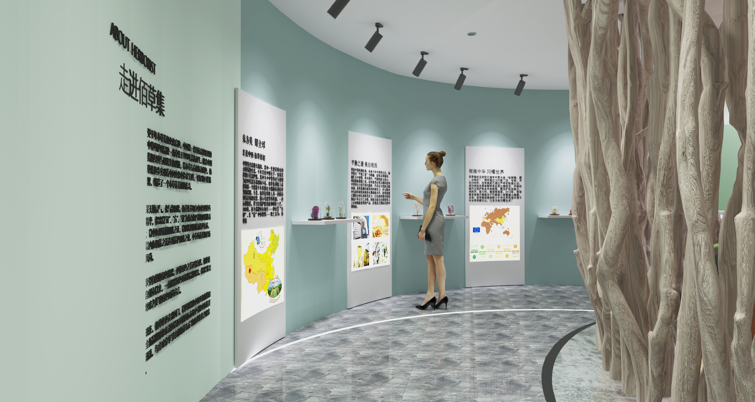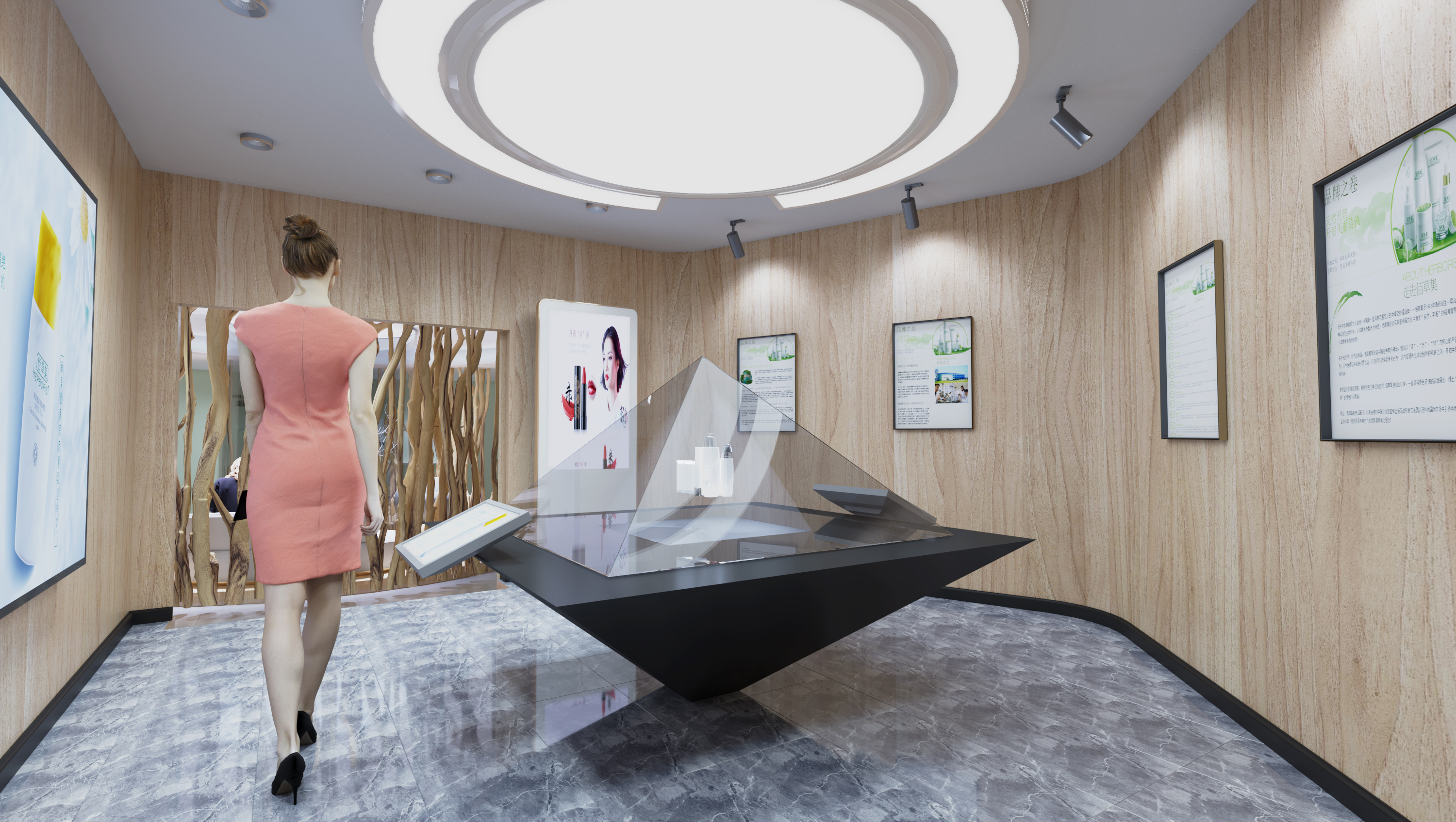本次设计是根据佰草集品牌自身特点和文化理念,利用了中草药、天圆地方、女性、阴阳、自然、循环这六个设计元素,以及佰草集的传统文化思想,融入于整个展厅之中,通过设计以及数字化设备的运用,让整个展厅与消费者之间产生更强的交互性。在颜色上的选取,从自然中提取主题色彩,让展厅的配色有依据,造型上的选取,通过设计元素的提取,将一些具象的事物转换为抽象的几何线条进行重新构成,设计出这些场景造型,材料的运用,选取木材质以及带有颗粒感的肌理漆,来适应自然的主题,同时墙面的细腻感,在触感上有一定的心理作用。以及根据人的消费行为,设计的流动路线等等。