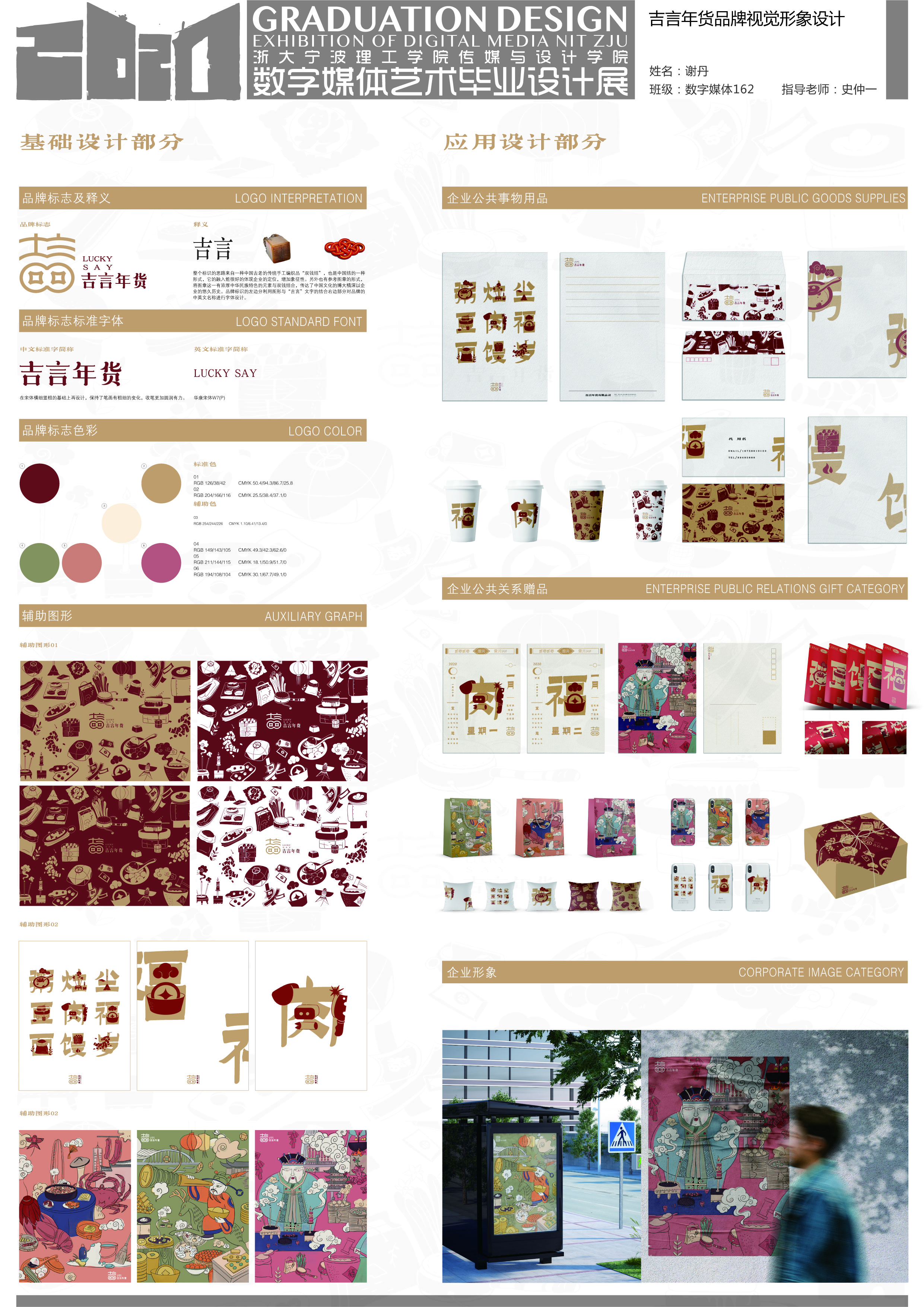 在时代高速发展的今日,传统文化似乎成了时代的眼泪,变成了老一辈人看似毫无意义的坚持。但精神的空洞一直存在,没有传统的支撑民族自豪感和归属感也会逐步削弱。市面上有关传统文化的产品视觉形象大多都停留在原地,没有跟上经济发展和人民日益增长的精神物质需求,使得市场的匮乏与对传统文化的漠视形成恶性循环。除了日益激烈的市场竞争外,企业品牌竞争也是不言而喻的。我选择的“吉言”是一个年货品牌,春节是我国民间最隆重且盛大的节日,承载了丰厚的历史文化底蕴和民族情怀,也与大众生活密不可分,在国际上也有一定的吸引力。因此希望通过对“吉言”品牌的理解和创造,找到方法帮助该品牌拥有一套自己的完整的VI设计其中也包括了对一些年货的再设计,在承担继承和发扬传统文化的同时,扩大企业形象影响力与竞争力,也可以刺激同类型品牌的诞生产生一定的社会影响力。