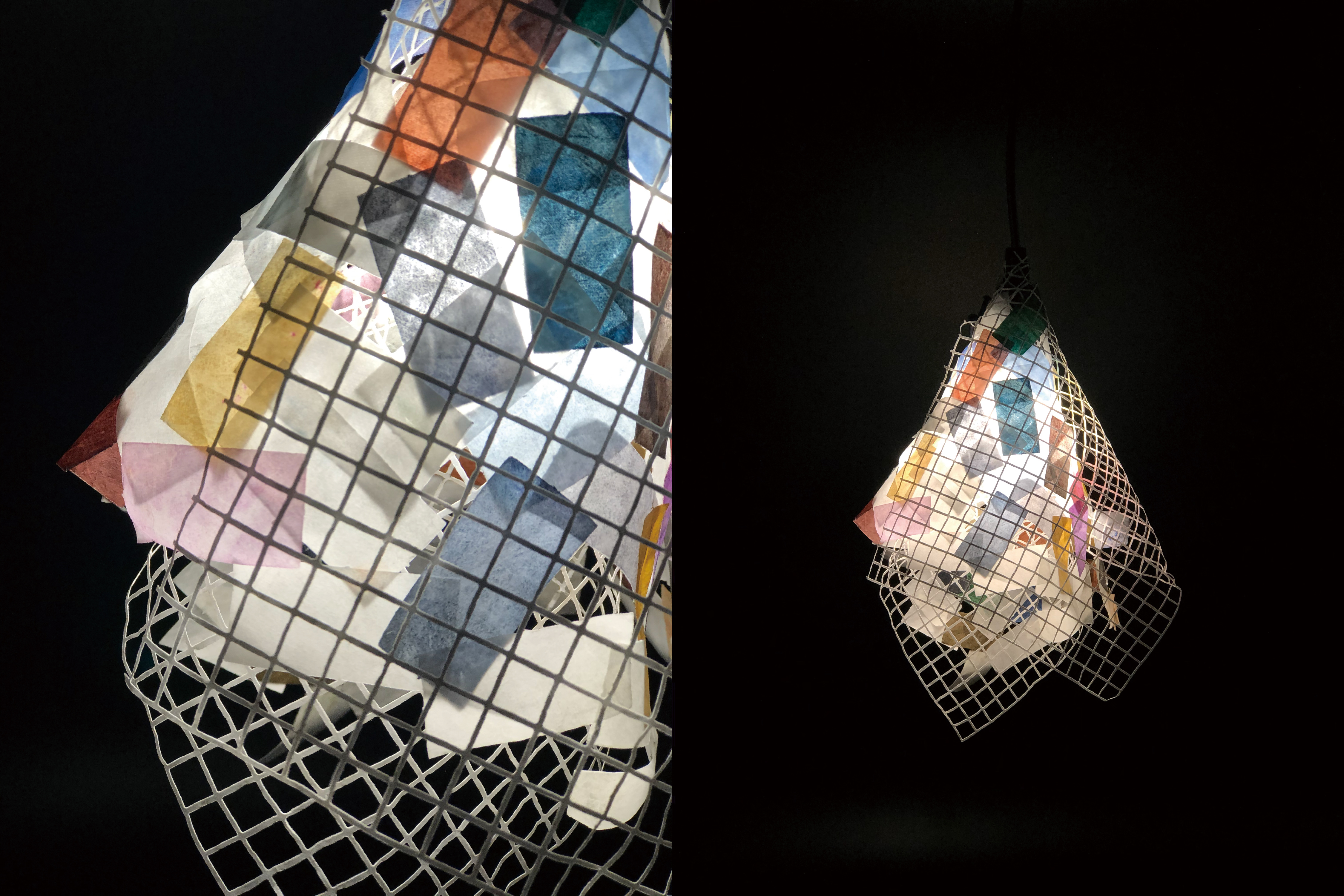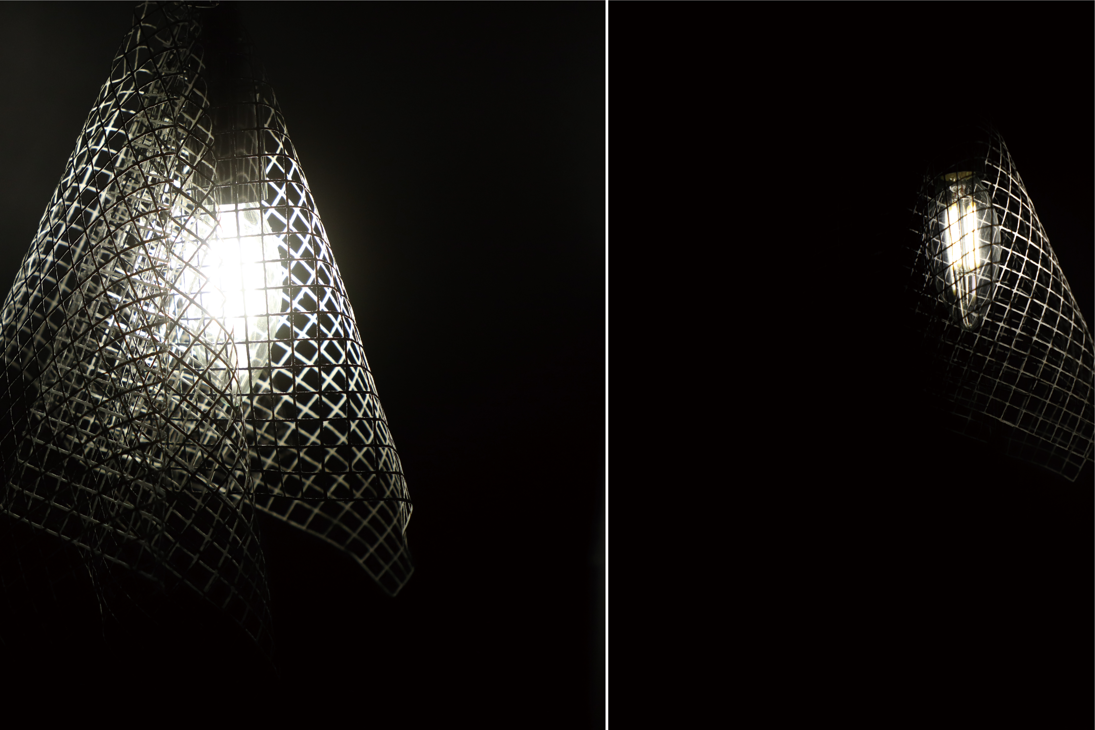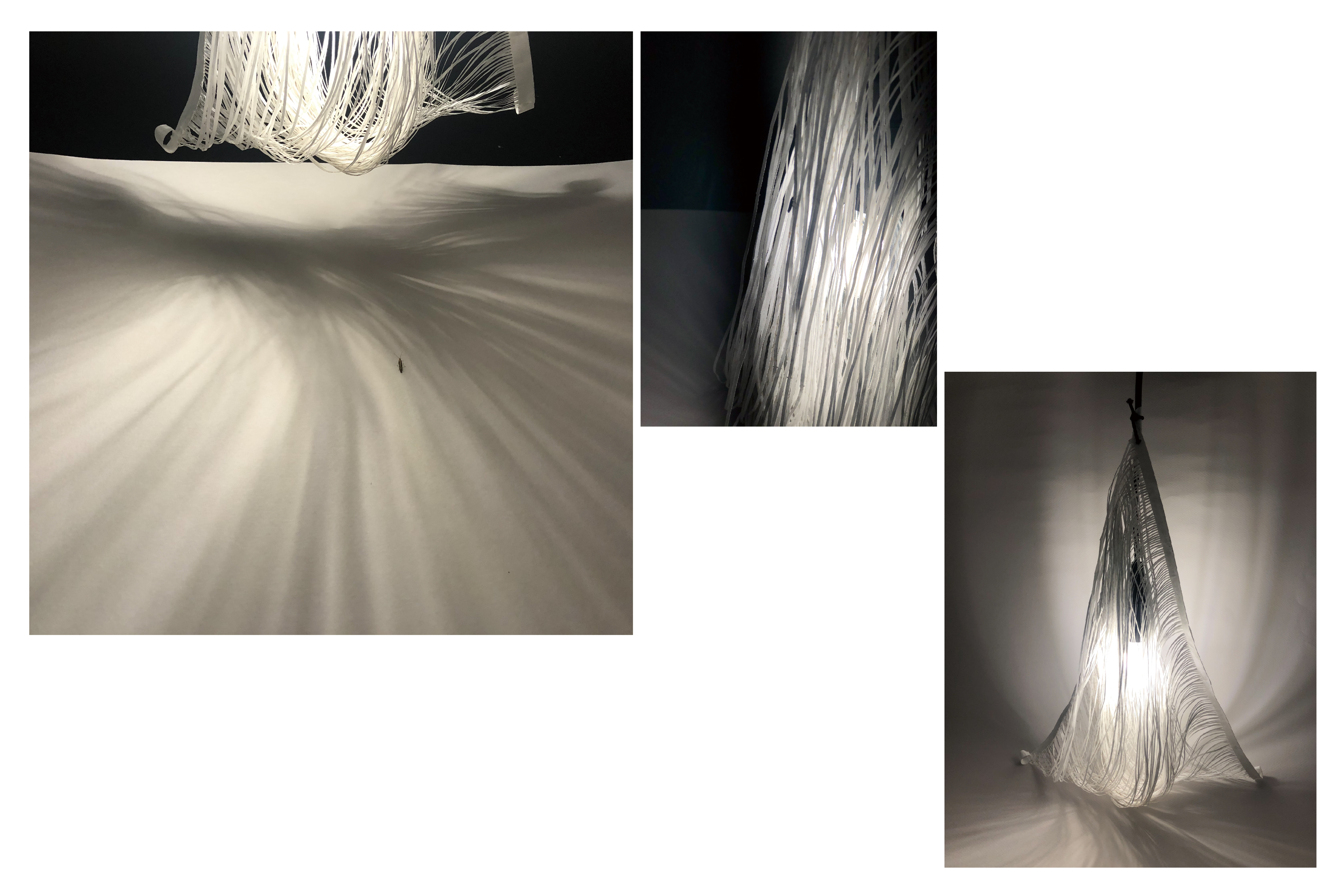 将杜邦纸通过褶皱、染色、切割、编织等手段的处理制作成形态各异的灯罩,令透过的光线变得千姿百态。在杜邦纸外层罩上一层黑色不透光卡纸,由用户亲手撕开卡纸,撕出想要的光线形状,为了卡纸容易撕开,在卡纸上雕刻了等边三角形阵列的易撕线。灯灭时,是五个形态大同小异的几何体,亮灯后,光线却能在人的参与下拥有无尽可能。