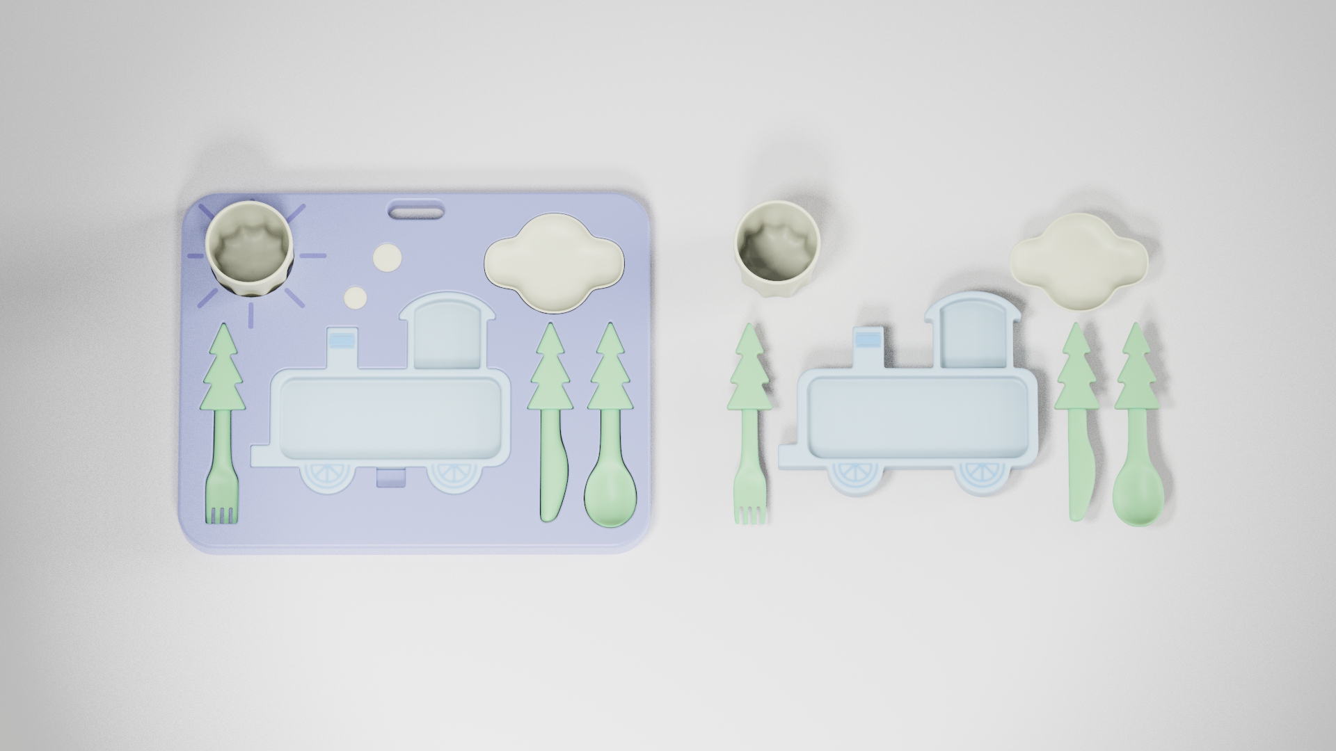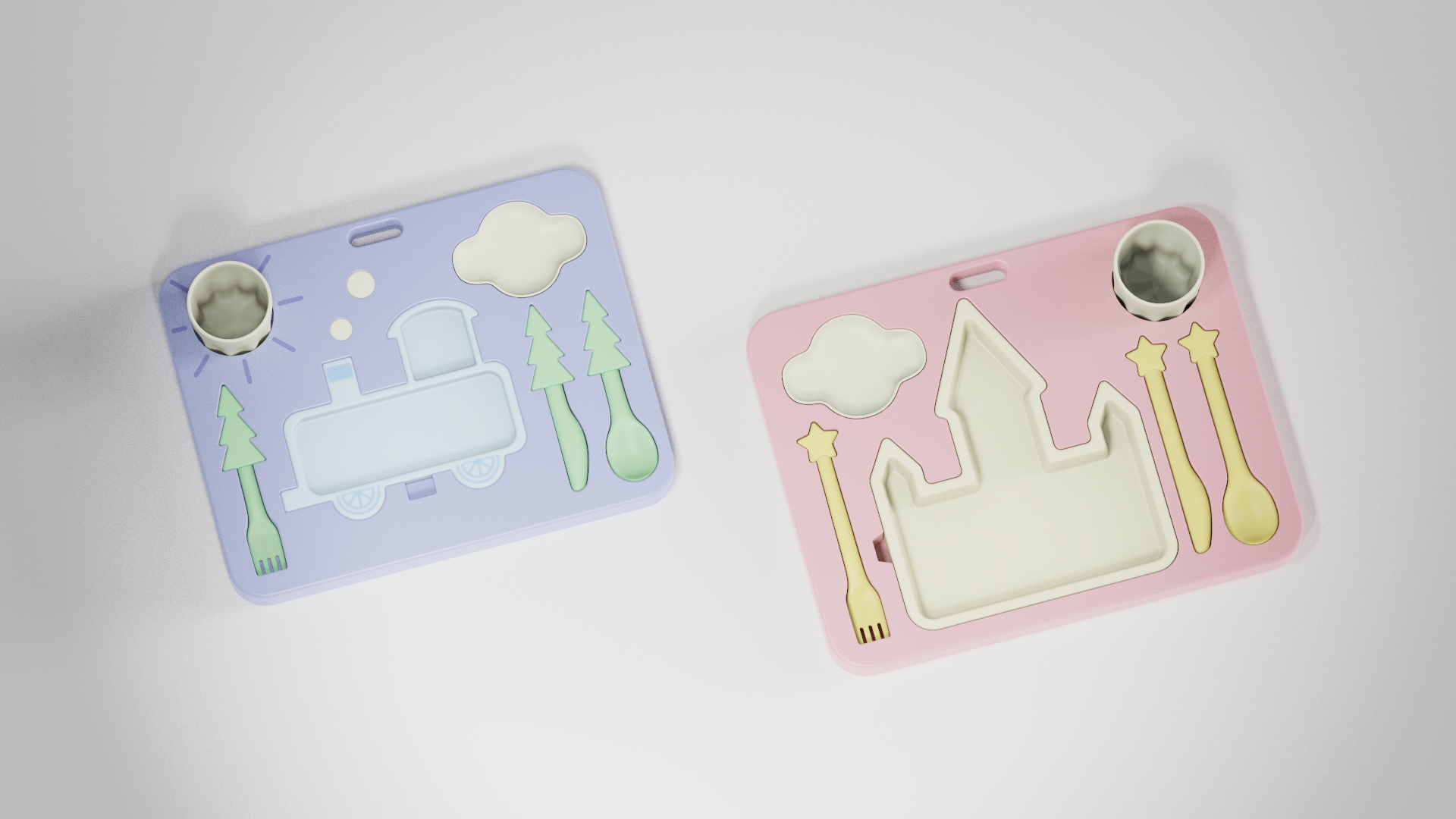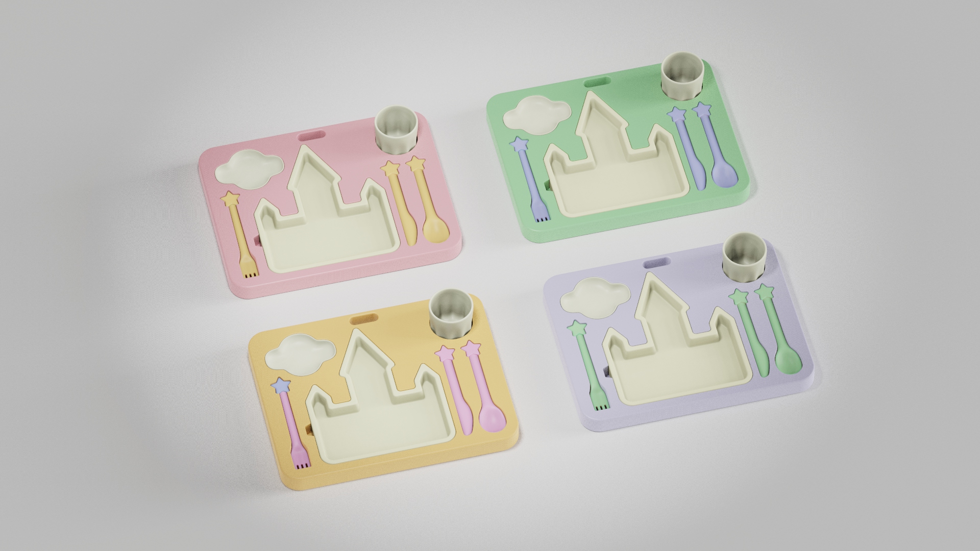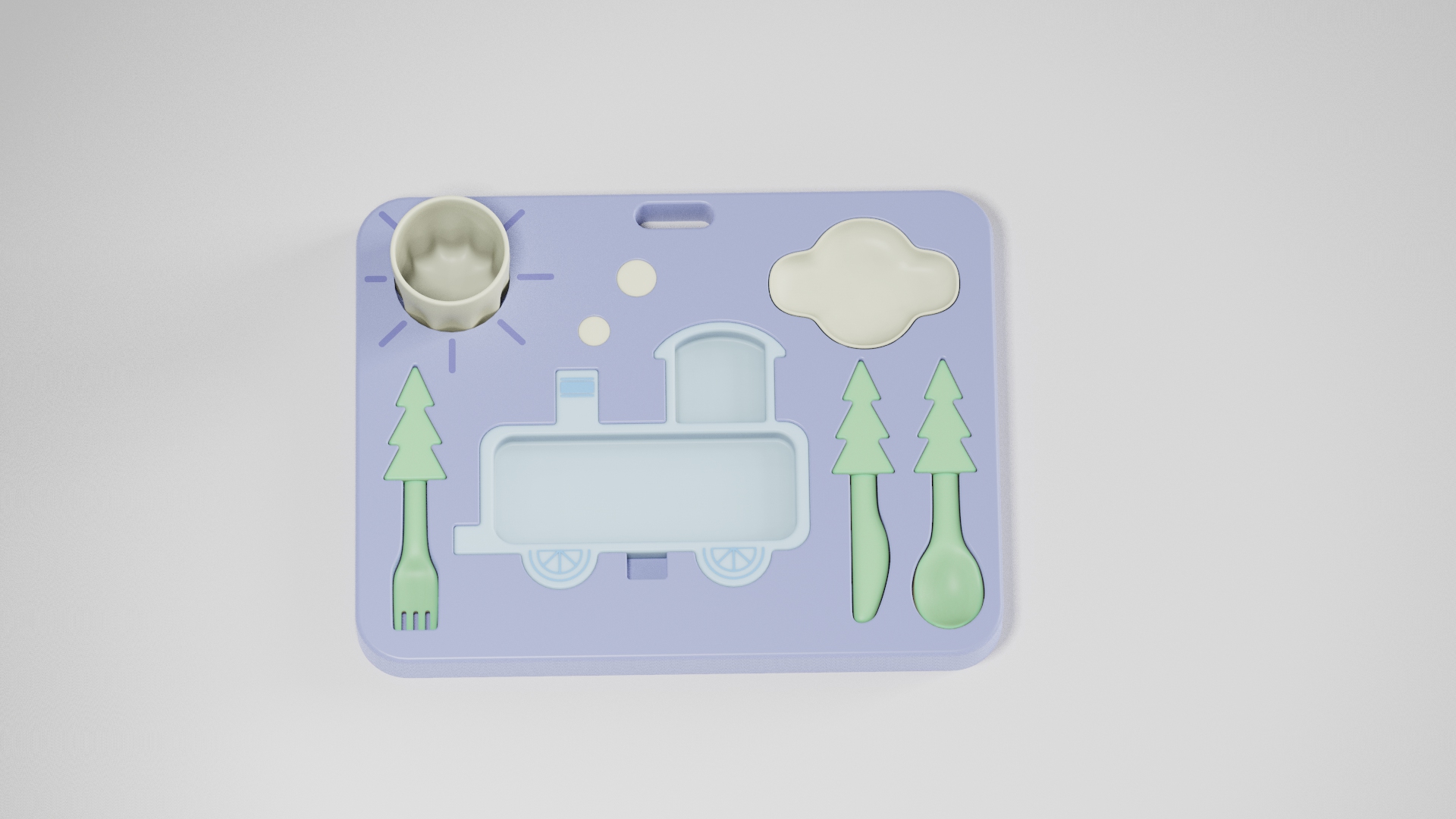 进食是培养孩子规则的重要契机之一,同时,饮食在儿童的生活中起着非常重要的作用,可以为儿童提供充足的营养,从而改善他们的身体状况,达到更好的生长发育效果。但在许多家庭中,仍然有很多的儿童在吃饭的过程中往往出现的挑食、偏食、吃饭不专注等不好的行为习惯,这对他们的健康和成长有很大的影响,甚至导致一些疾病。本课题主要通过对儿童餐盘、餐具的设计改善儿童不良的饮食习惯:将儿童平时所接触的儿童画区块图形化、使得餐具的形式变得更加有趣:平常图画绘本里面的太阳变成了水杯,云朵变成了果盘,轰隆作响的火车成了餐盘。通过有趣图形的使用,吸引儿童的关注度,让孩子在吃饭中感受到快乐。同时儿童在结束用餐后,整体餐盘的设计引导儿童将餐具放回整体餐盘,自主形成对餐具的收纳整理意识。
