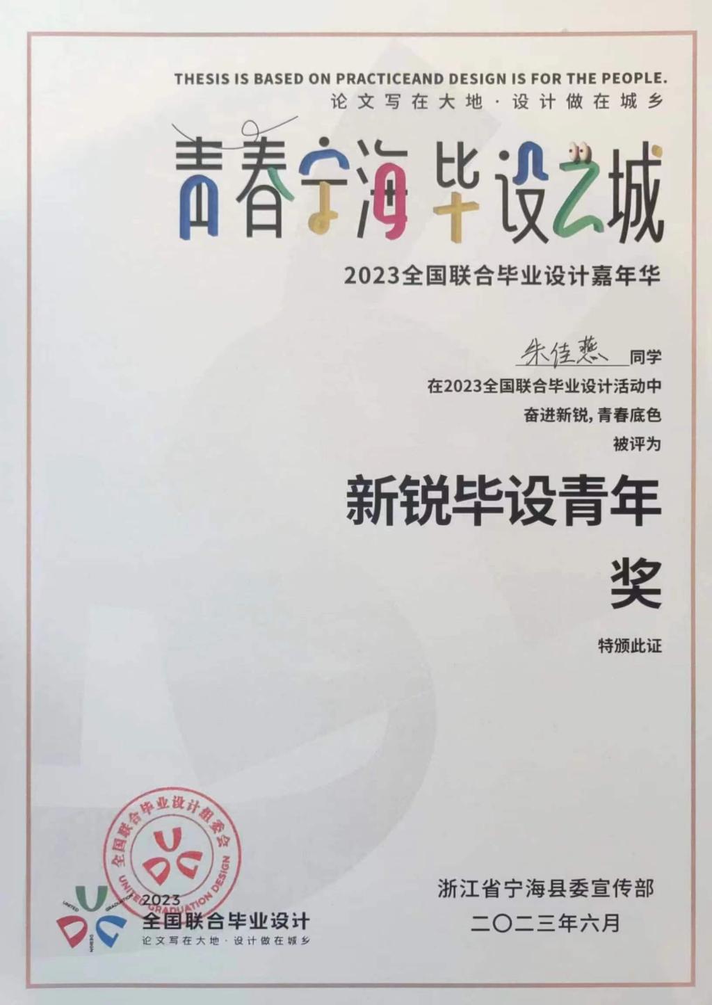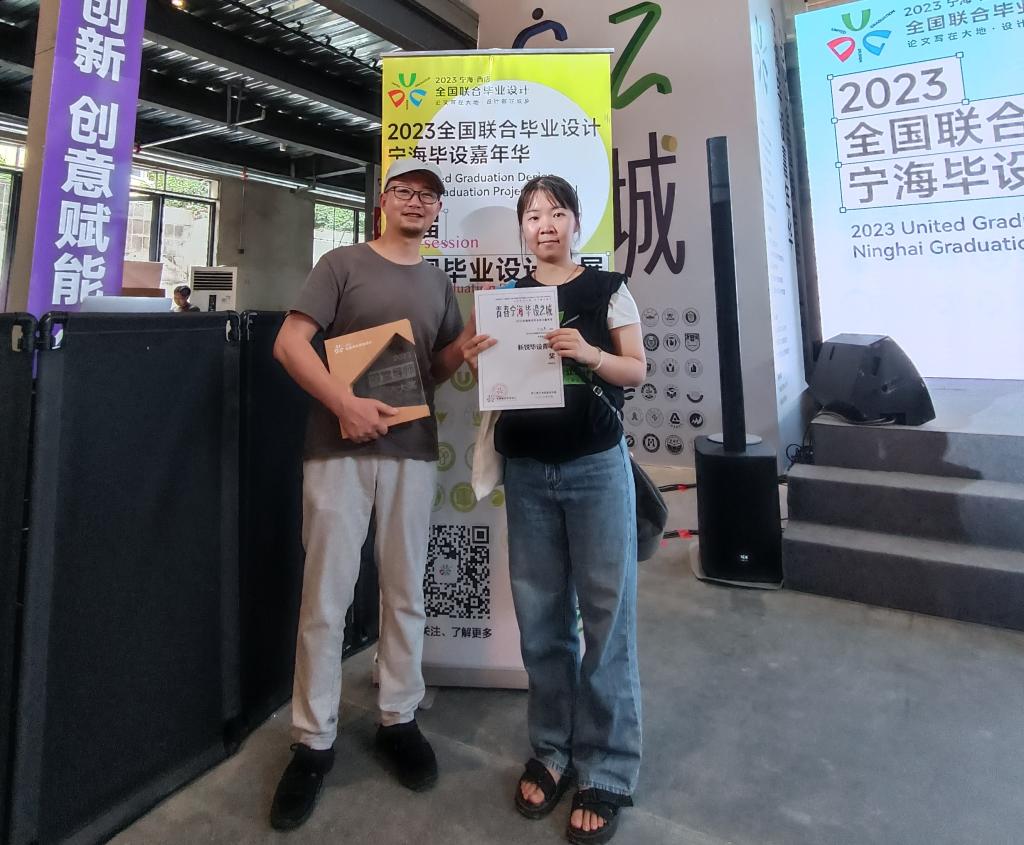 2023全国联合毕业设计答辩及展览于6月20日在宁海县的“来in南”互联网文创园举行。今年的主题是“艺术振兴乡村”。公司yl永利集团官网登录共有6份优秀作品入选决赛,最终,建筑学181班朱佳燕同学的作品《基于场所精神的宁海团堧村公共空间改造提升规划建筑设计方案》获得了“新锐毕设青年奖”,并获得2000元奖金。建筑系范俊杰老师获得“殿堂导师奖”。