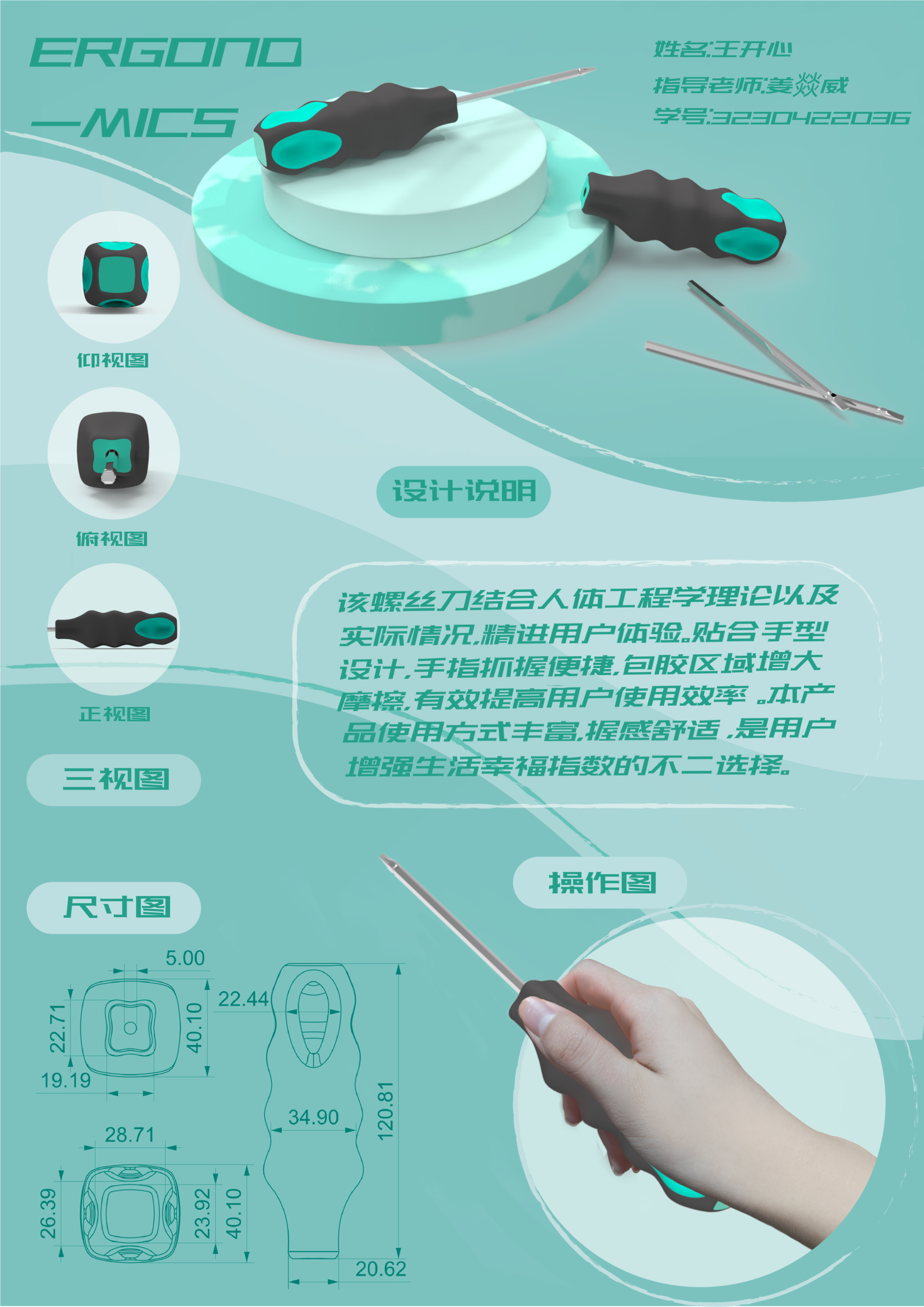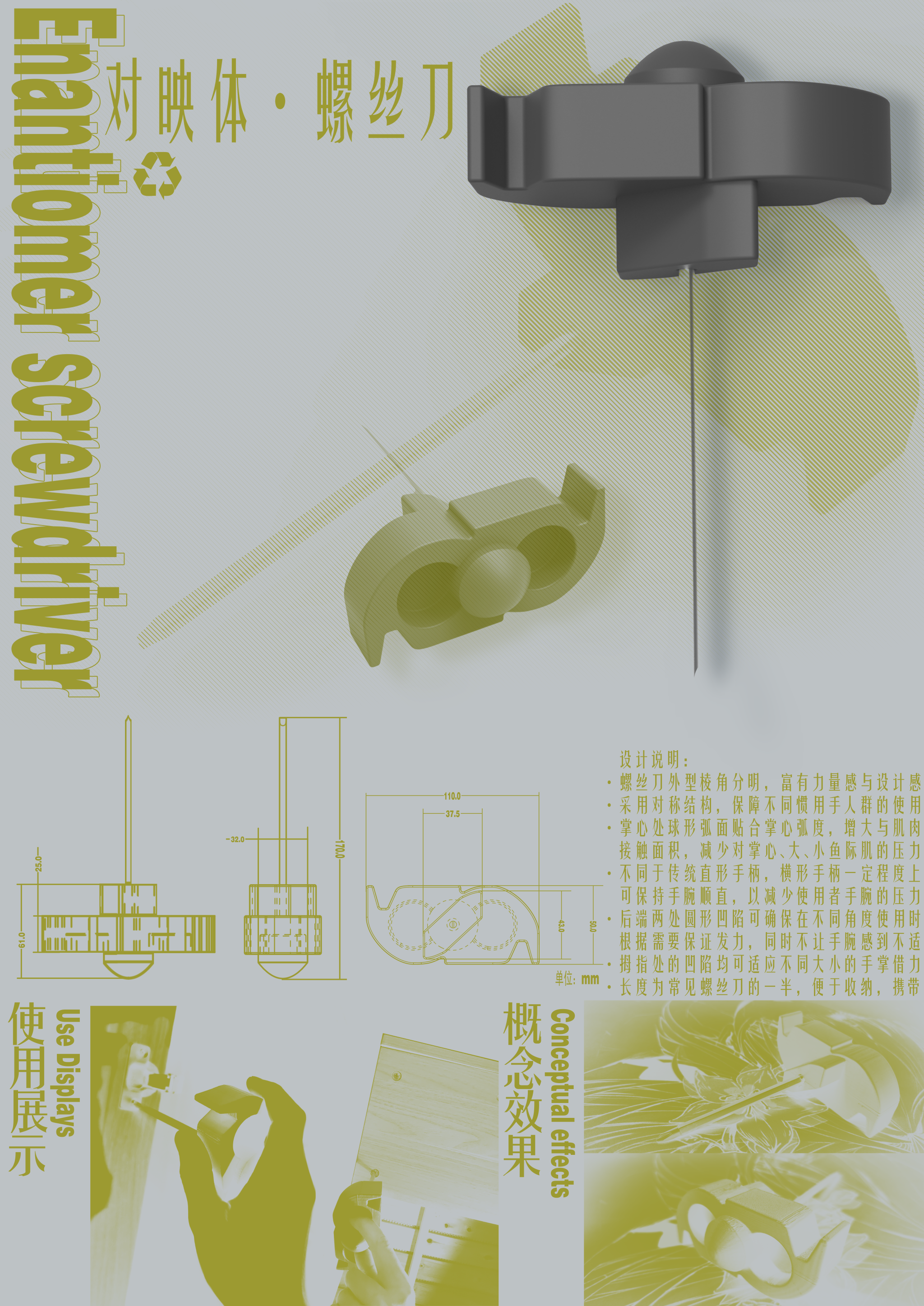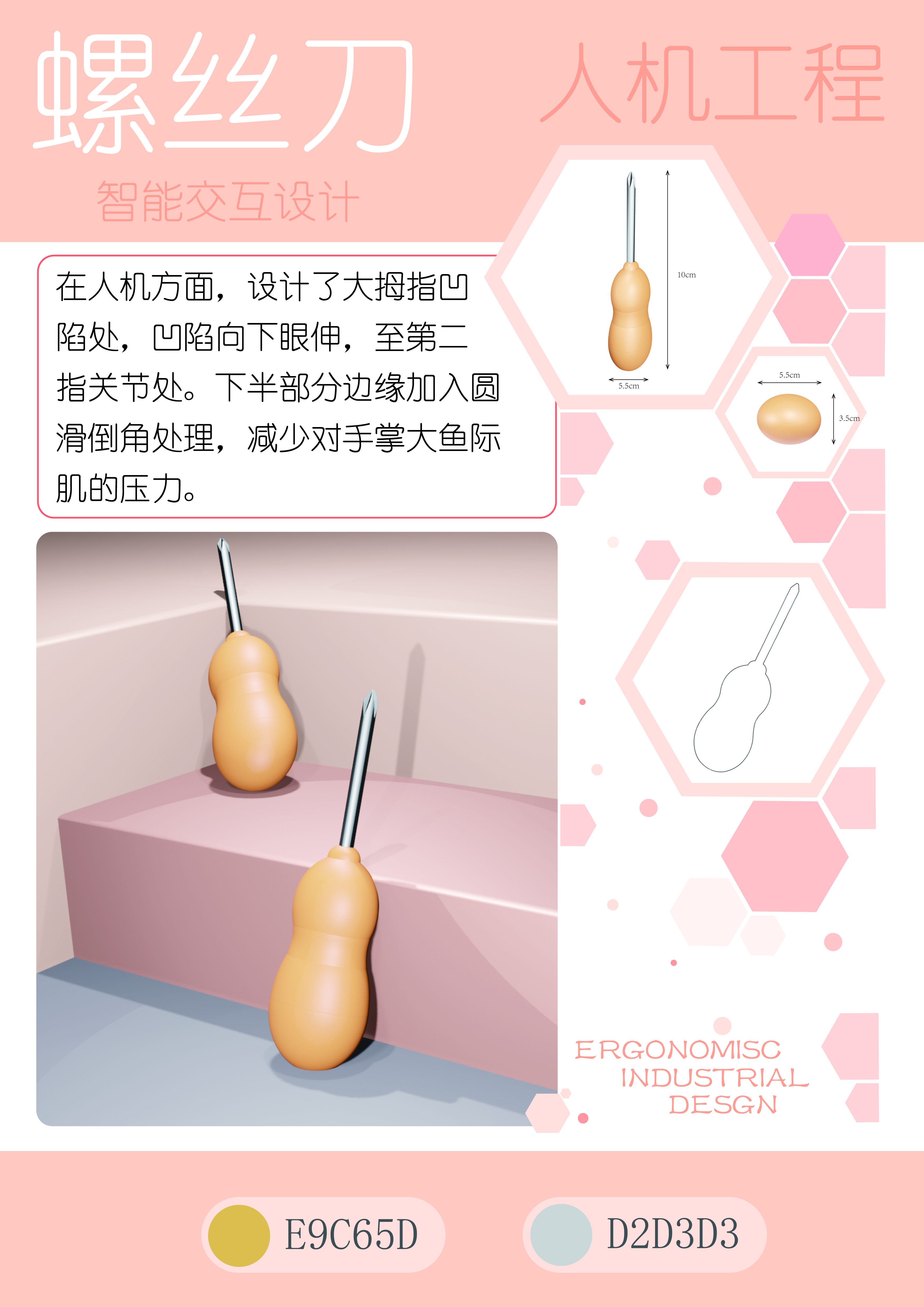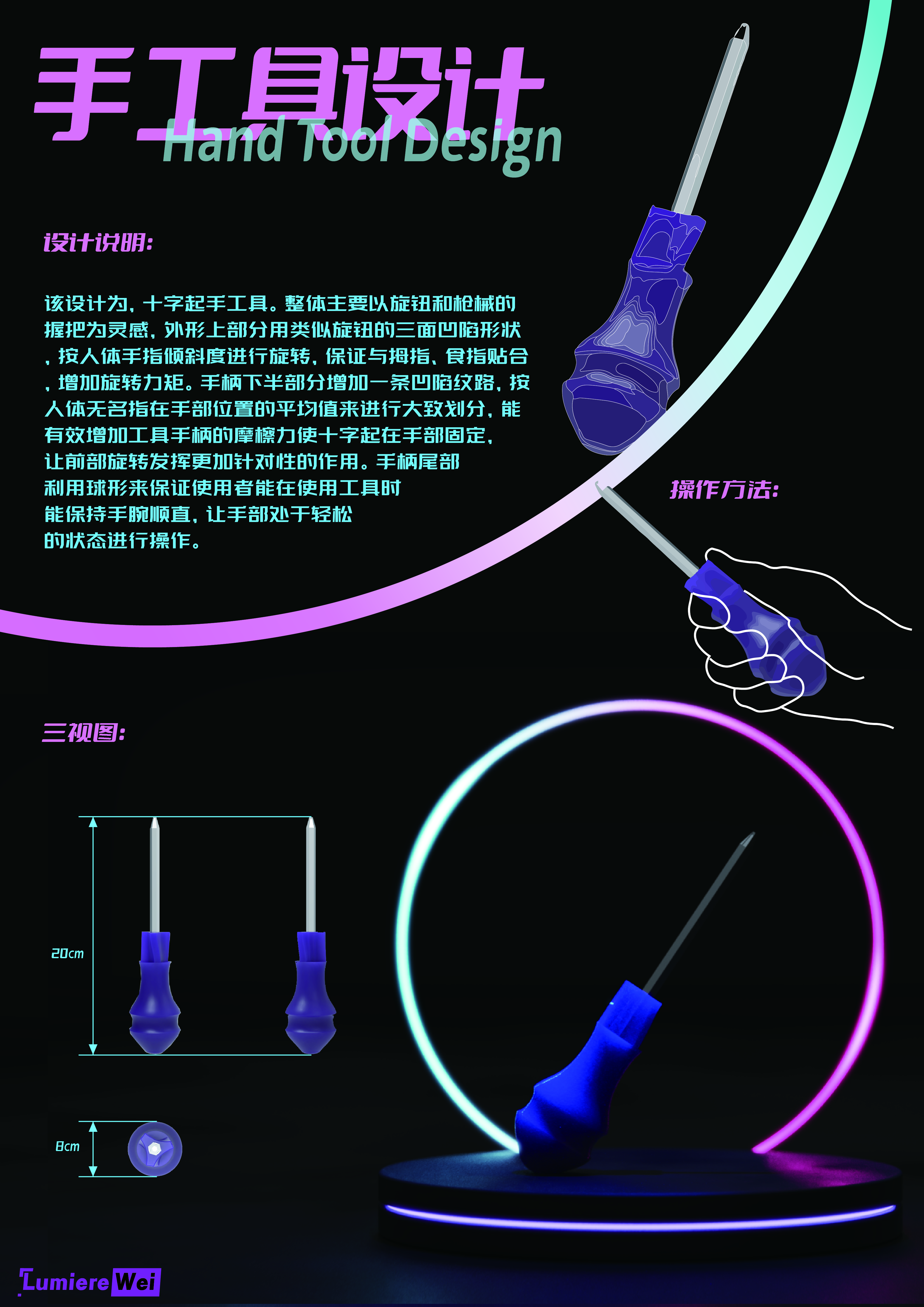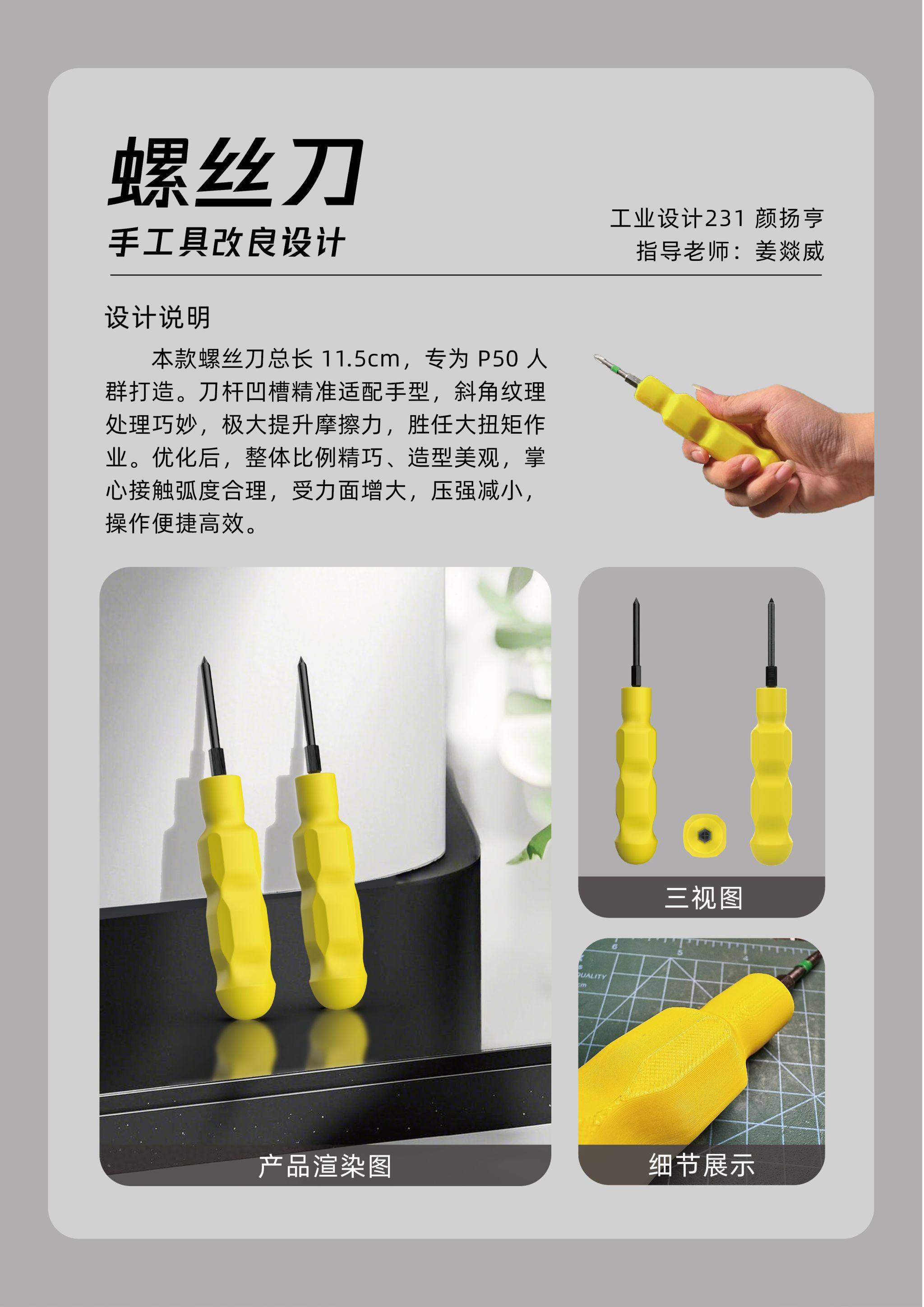 手工具是人机工程学研究的经典对象,也是检验人机工程学原理应用能力的实践案例。本模块任务中,员工以螺丝刀或削皮器为研究对象,通过实际体验进行问题分析,制作泡沫模型,并根据手工具设计原则反复调整,最终完成3D打印模型的设计与优化。本展览板块共展示了90件手工具设计作品,涵盖了员工在手工具的持握姿态、贴合手型以及提升人机舒适度等方面的创新成果。每一件作品都凝聚了员工对工具使用场景的深入研究,践行了“以人为本”的设计理念。