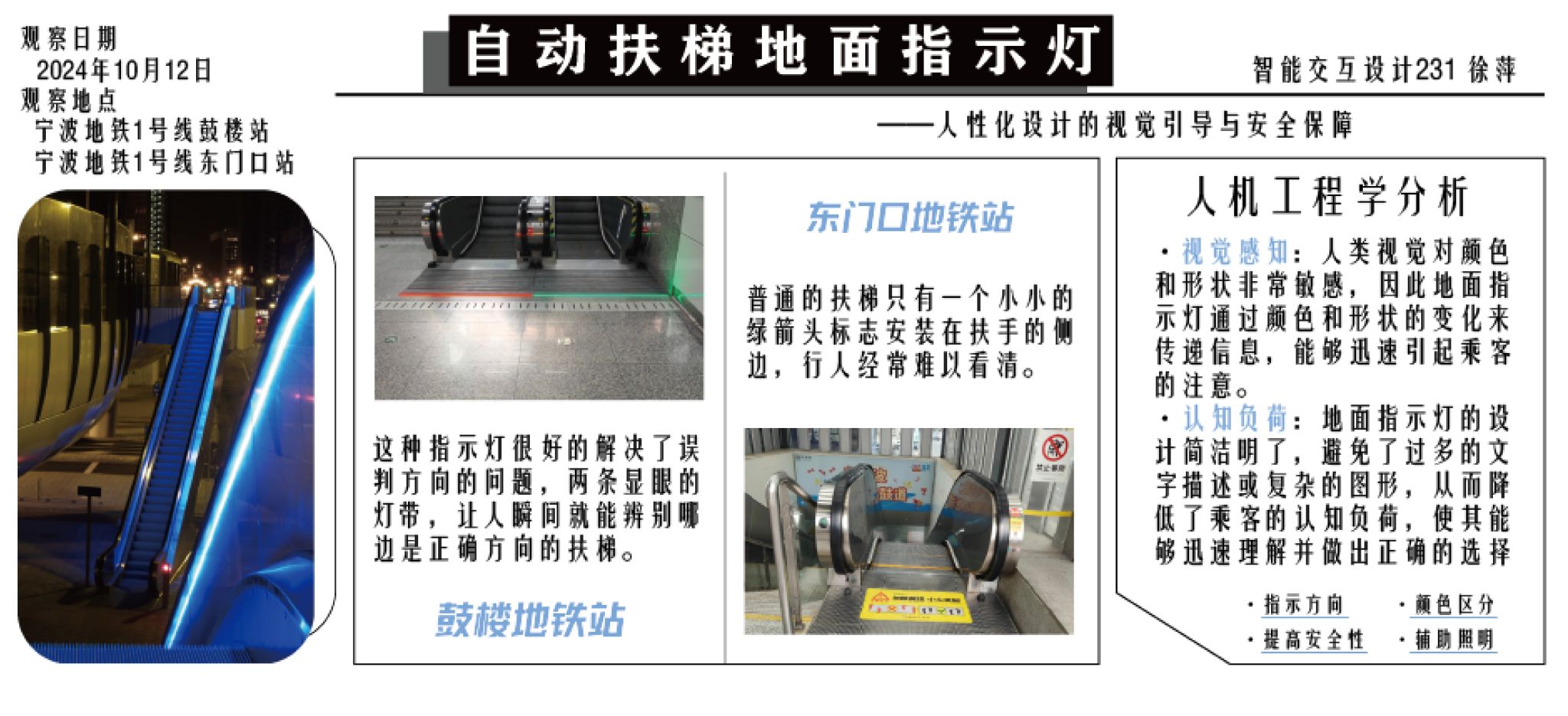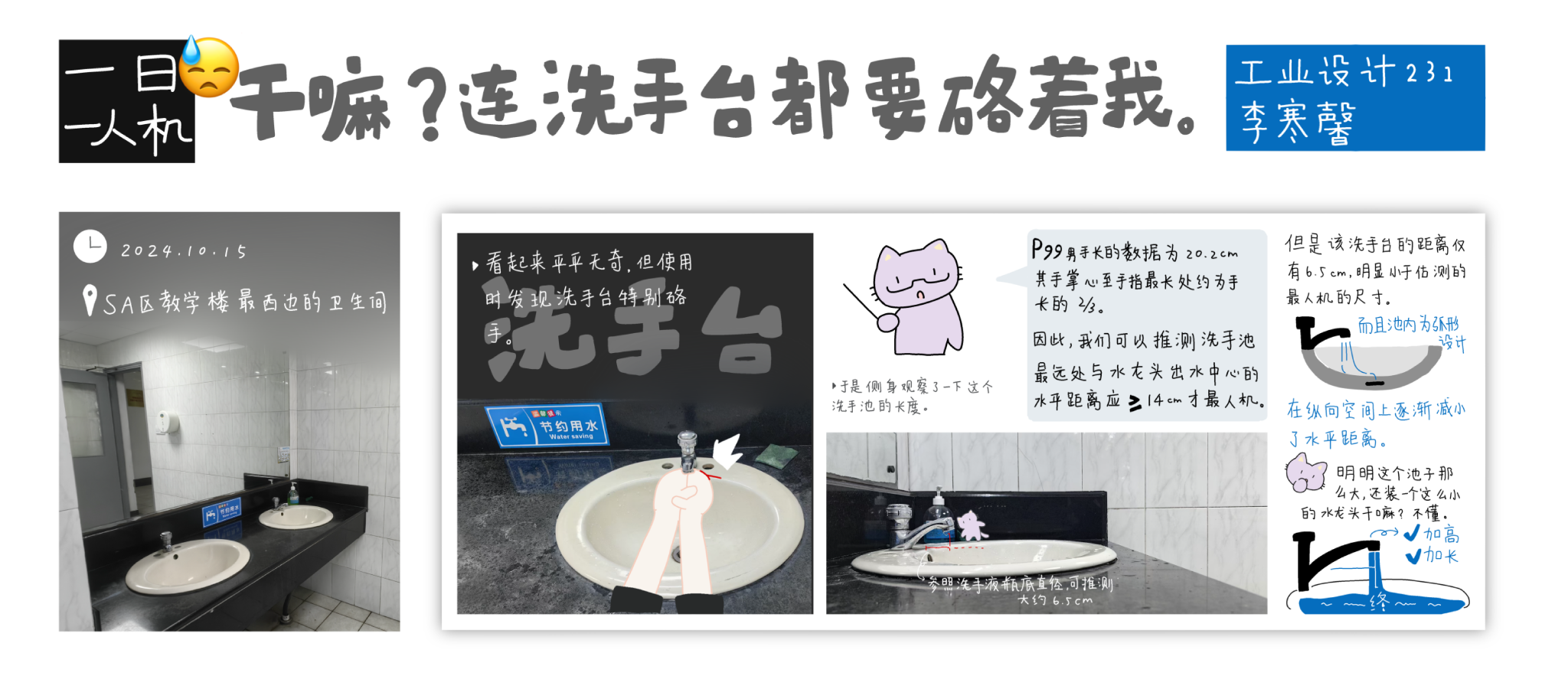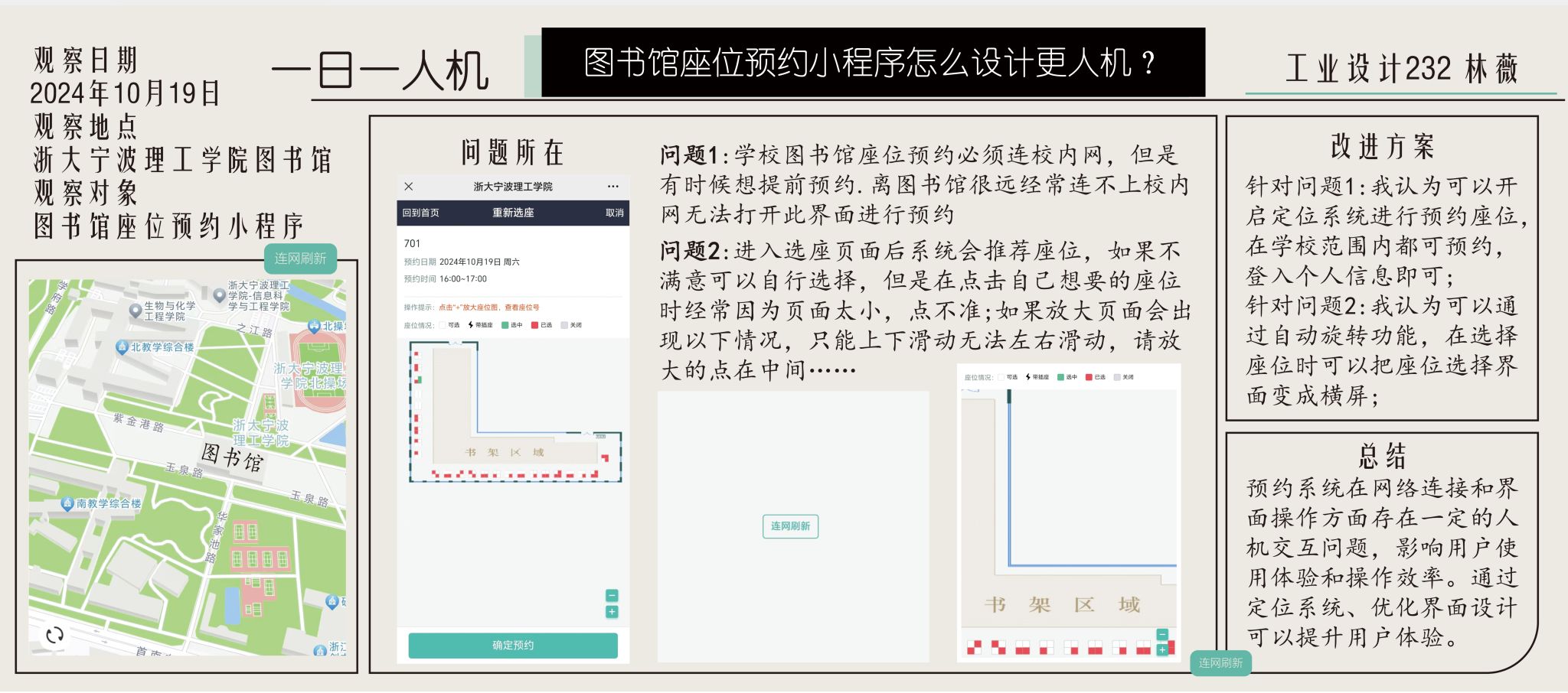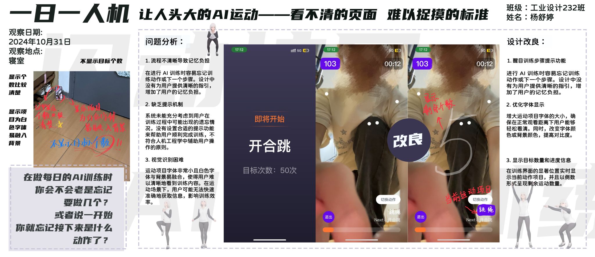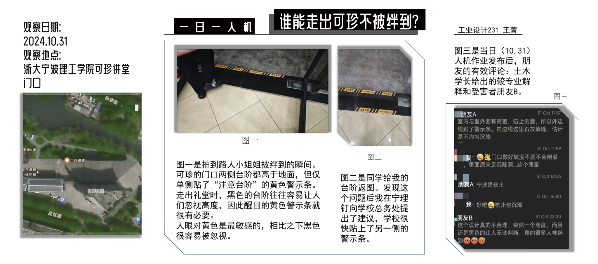 “一日一人机”是《人机工程学》课程的一项长期观察性作业,要求员工连续一个月,每天记录一个生活中的人机交互问题,并围绕该问题进行系统化的人机工程学分析,同时将作业内容发布于社交媒体平台。该任务旨在培养员工对日常生活的深刻洞察力,提升其对人机设计问题的敏锐感知能力,并锻炼员工在实际场景中识别、分析和解决问题的综合能力。通过持续的观察与反思,员工不仅能够深化对人机工程学核心理念的理解,还能为后续设计实践奠定坚实的基础。此外,将作业内容发布在社交媒体上,使设计思维直接触达用户,而与用户互动及时获得反馈正是设计不断优化和提升的重要环节。