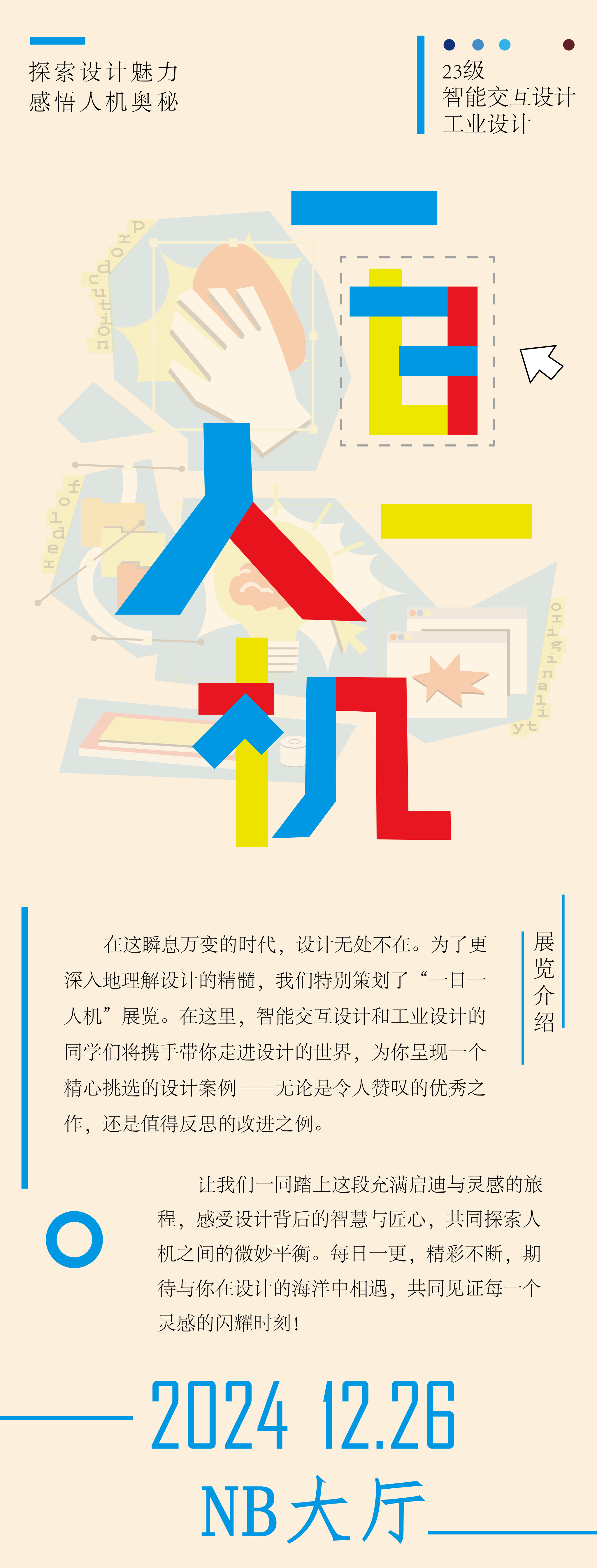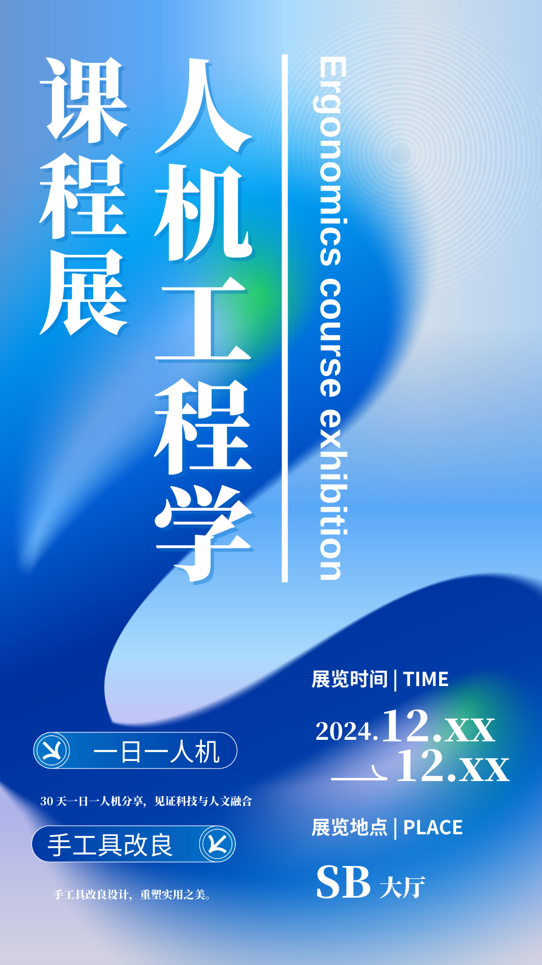 12月30日,智能交互设计与工业设计两个专业《人机工程学》课程联展在SB大厅展出。本次展览以“人机洞察与设计创新”为主题,分为两个展示板块:“一日一人机”与“手工具改良设计”。