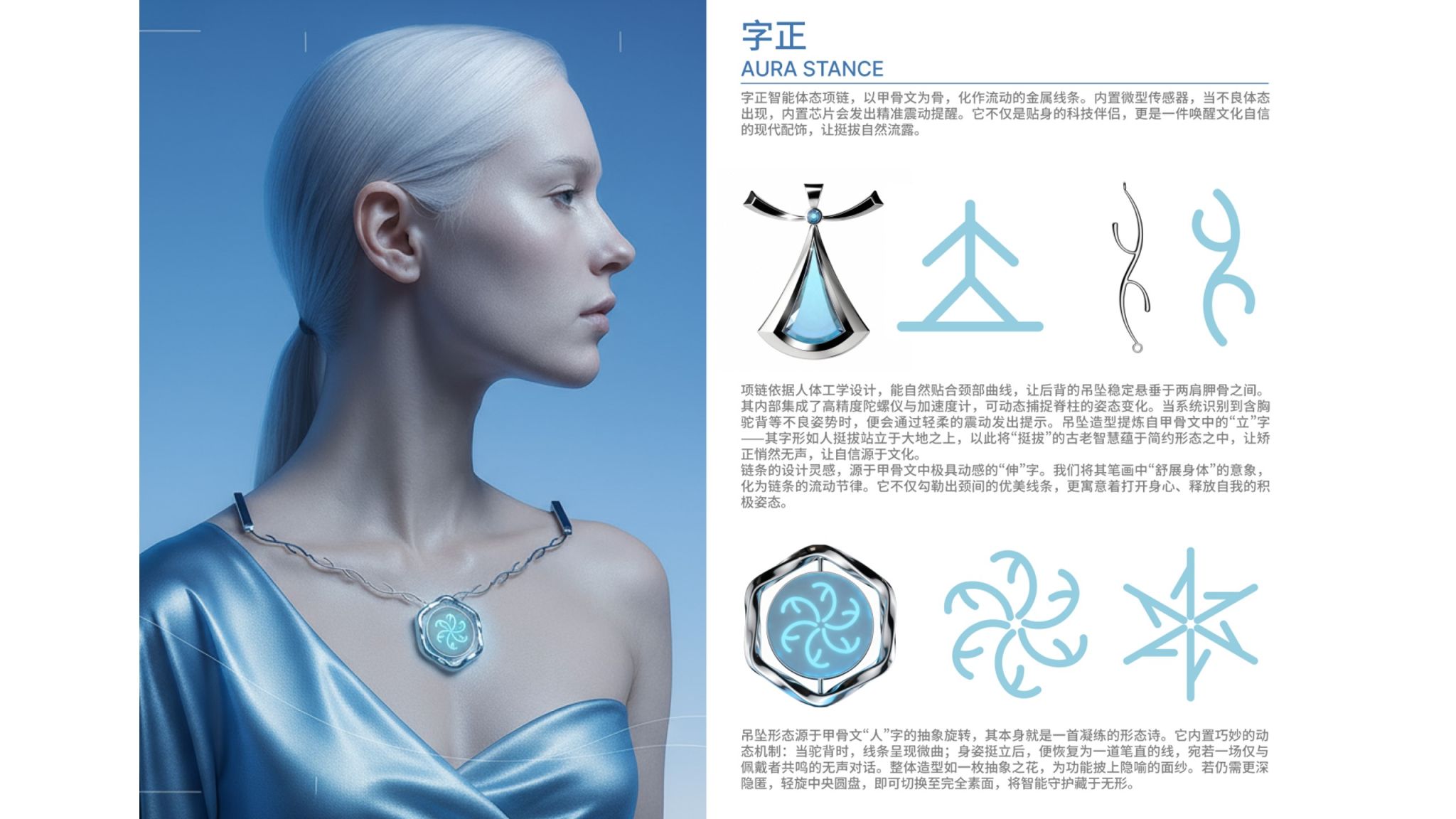 作品简介:字正智能体态项链,以甲骨文为骨,化作流动的金属线条。内置微型传感器,当不良体态出现,内置芯片会发出精准震动提醒。它不仅是贴身的科技伴侣,更是一件唤醒文化自信的现代配饰,让挺拔自然流露。