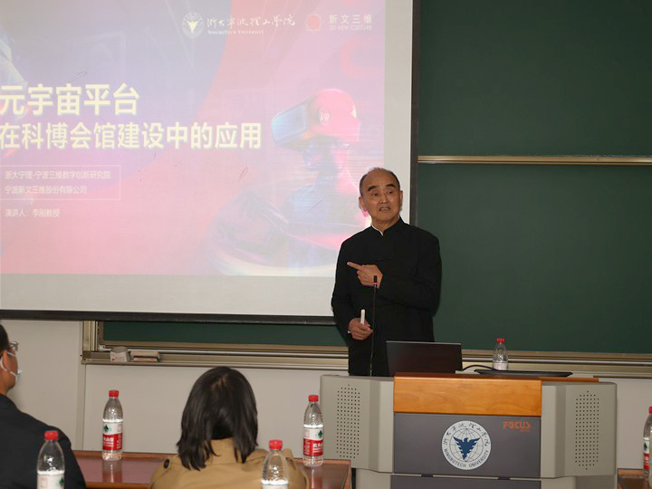 5月11日,由yl永利集团官网登录、宁波新文三维股份有限公司主办,浙大宁理—宁波三维数字文化创新研究院承办的“元宇宙平台在科博会馆建设中的应用”报告会在永利集团官网SB201举行,新文三维公司董事长、浙大宁理—宁波三维数字文化创新研究院经理李刚教授受邀为报告会主讲人。公司党委书记吴春、新文三维公司行政总监石英、员工设计师毛岱琦及yl永利集团官网登录一百多位师生参加此次报告会。报告会由公司党委副书记叶卫树主持。