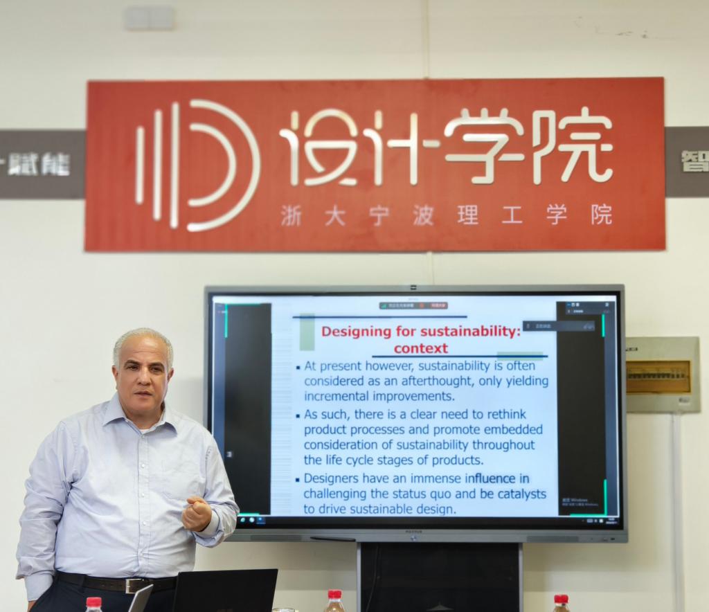 Mohamed Osmani教授以其深厚的学术功底和独特的视角,从四个维度分三场讲座展开了深入浅出的讲解。他首先阐述了为地球和人类幸福而设计的思想流派,涵盖了工业生态学、系统理论、仿生学等多个前沿领域,为师生们打开了一扇通往未来设计理念的大门;随后,他聚焦于地球的幸福与人类的幸福,结合具体案例深入剖析了可持续设计、全生命周期分析、循环经济设计和生态设计策略等先进理念,为师生们提供了宝贵的实践指导;此外,他还特别介绍了艺术疗愈的研究现状及其对提升幸福感的重要作用。最后,他还就相关领域研究的文章发表和期刊论文写作提供了宝贵的指导和建议。