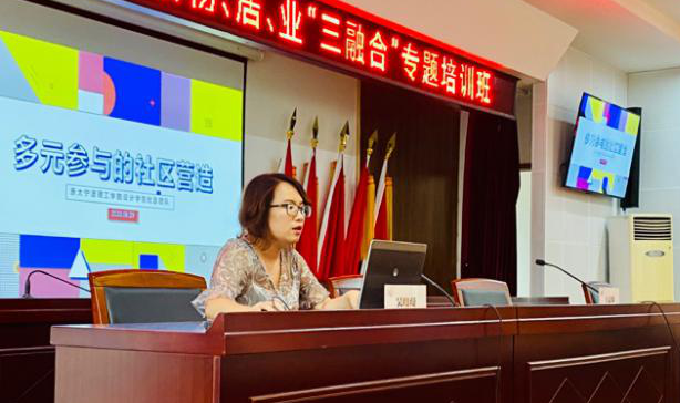 倪骋主任做开场主持,介绍了培训班议程并欢迎社区营造团队的到来。钱连波书记就当下的基层社区治理工作面临的新挑战做培训动员部署讲话,并强调新形势下党建引领、物居业“三融合”的必要性。社区营造团队领队王志蓉副教授对街道的邀请表示感谢,并介绍了团队成员及授课主题。吴珊珊老师围绕“多元参与的社区营造”主题进行台湾社区营造的经验分享。张倩茜老师从空间更新角度论述规划、建筑、景观维度在社区营造里的行动路径,并介绍了团队已有成果及已开展的街校联盟行动。