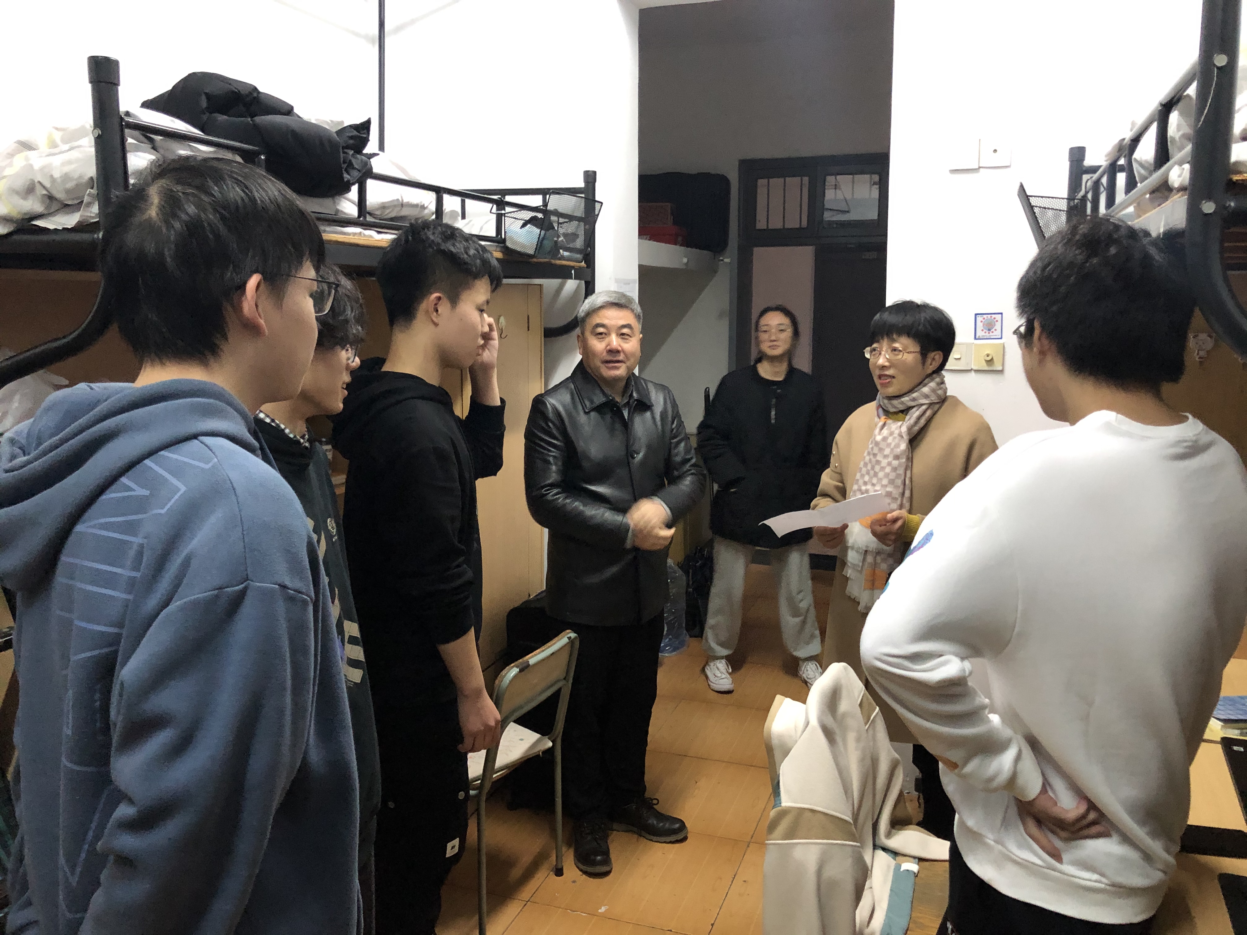 章献民走访建筑学202,工业设计201相关男生宿舍,与同学们促膝交谈。他勉励同学们一要志存高远,把自己的命运和祖国民族的命运联系在一起,要主动对接国家战略需求,学好本领,更好地为祖国建设服务。二要夯实基础,章献民亲切地翻开同学们在复习的大学英语和高数课本,指出数学是一切学科的基础,大学阶段打好基础非常关键。英语是高层次就业的敲门砖和升学的点金石,不管是对国内升学和出国都起着重要作用,希望同学们利用碎片时间努力学好英语。另外,大学阶段也是一个人提升各方面能力的关键时期,同学们要多参加社会工作,在工作中得到锻炼,达到知识、能力、素质的全面提升。三要独立思考,一个人思考有多深,走得就有多远。在大学阶段要培养独立思考的能力和敢于质疑的精神,不要人云亦云,多想想为什么,无论在人生还是学术上都要多问自己几个为什么,培养自己独当一面的能力。四要热爱生活,一个人成长过程中难免会遇到各种挫折和困难,要积极乐观地对待它们,克服困难的过程也是一个人成长历练的过程;要用一双发现美的眼睛,去感受生活中的小确幸;五要强健体魄,身体是革命的资本,大学阶段是锻炼身体的好时光;一切工作以身体作为基础,利用大学时光加强身体素质,每天锻炼一小时,健康工作五十年,幸福生活一辈子。
