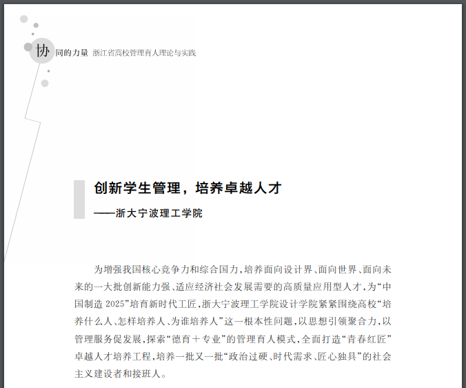 近日,浙江省教育厅主编《浙江省高校“三全育人”综合改革理论与实践》丛书在浙江省高校“三全育人”综合改革推进会上首发,公司两个育人案例入选本套丛书,分别是《创新员工管理,培养卓越人才》管理育人案例和《“红色设计”让党旗在育人第一线高高飘扬》组织育人案例。