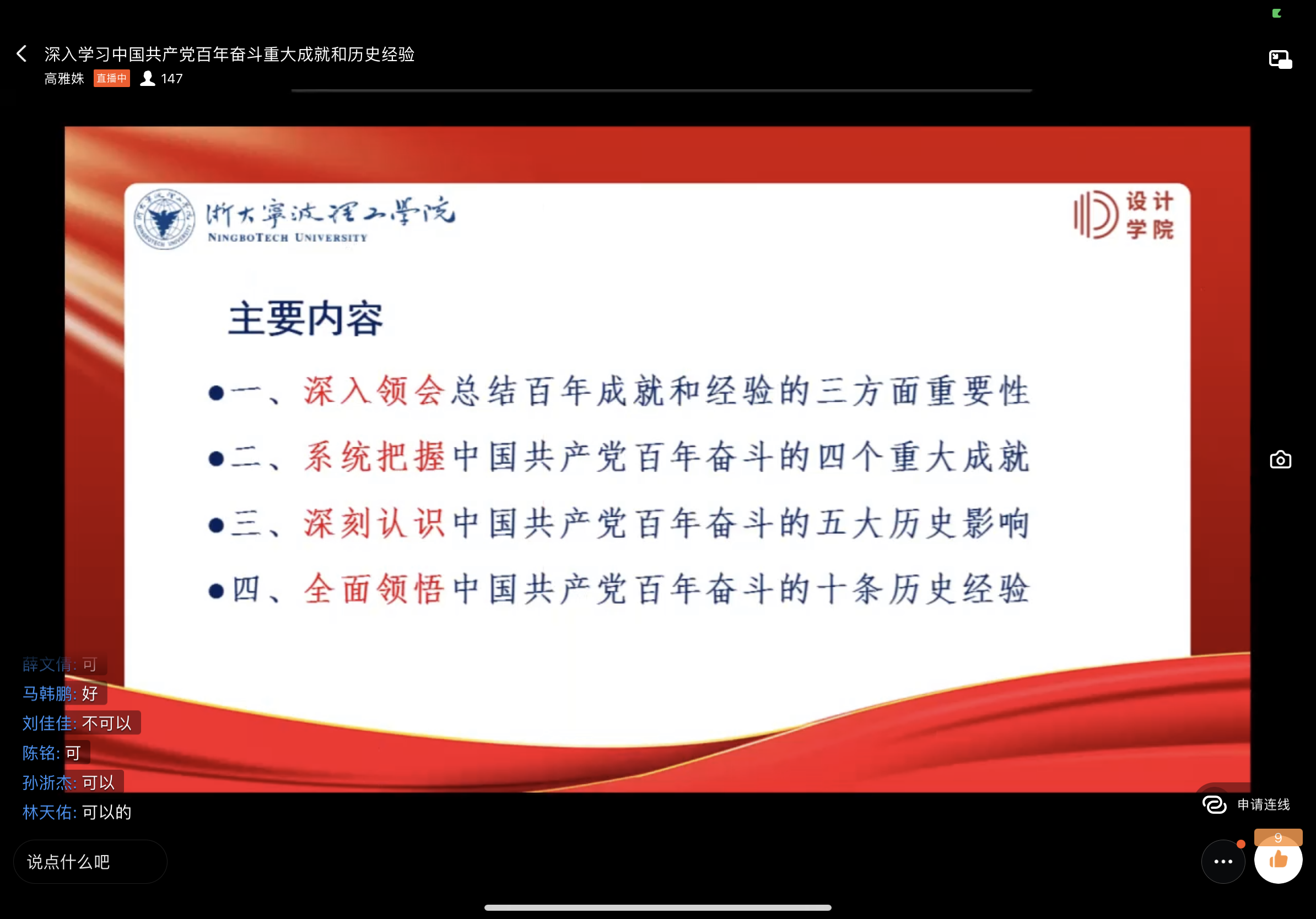 为深入学习贯彻党的十九届六中全会精神,扎实推进“六讲六做”大宣讲活动,12月19日晚,yl永利集团官网登录开展“深入学习中国共产党百年奋斗重大成就和历史经验”为主题的云宣讲,主讲人为青春宣讲员高雅姝老师。yl永利集团官网登录全体员工党员、员工干部以及“青春红匠”宣讲员们参与学习。