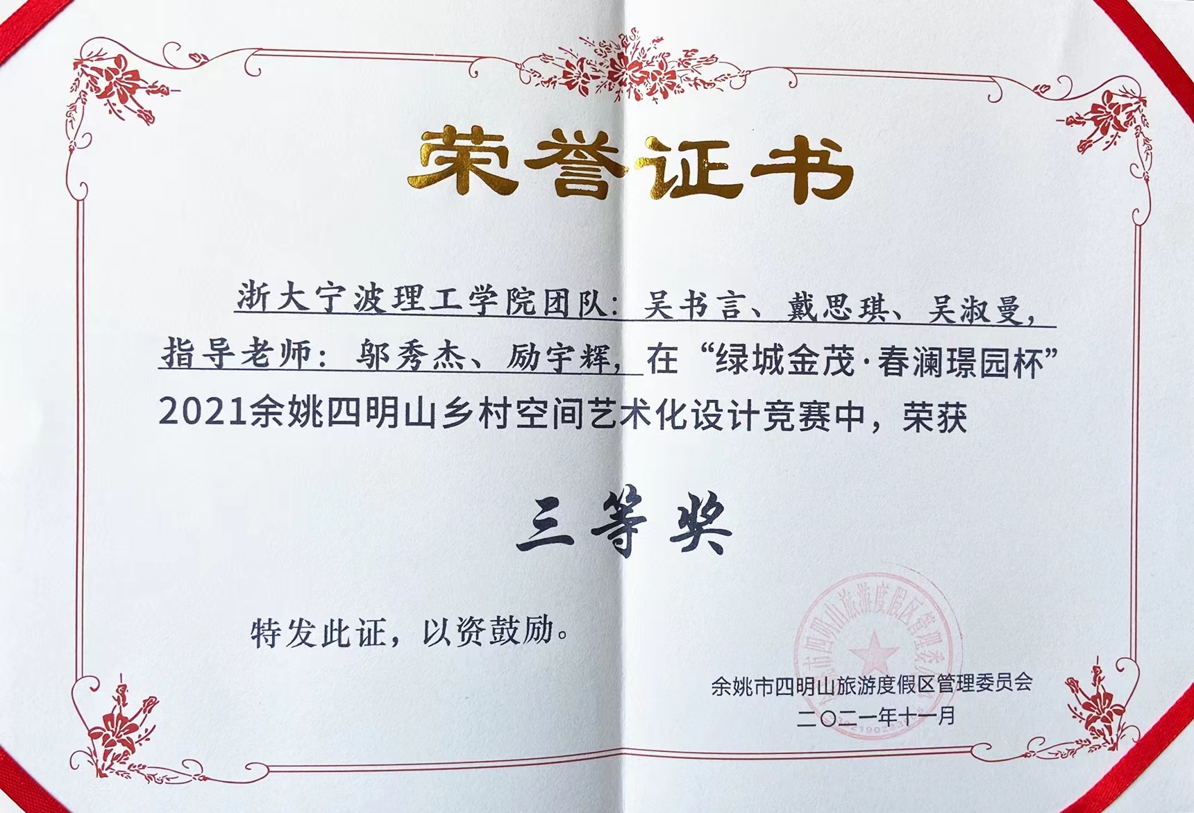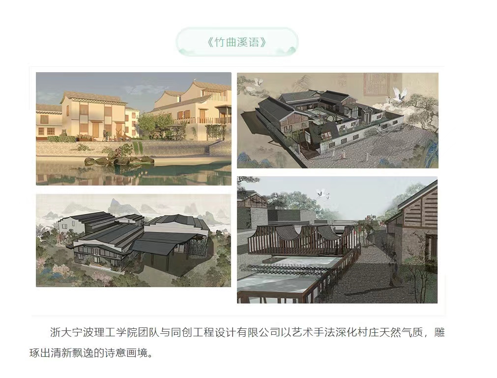 由余姚市四明山旅游度假区管理委员会主办、余姚浙协置业有限公司承办的“绿城金茂·春澜璟园杯”2021余姚四明山乡村空间艺术化设计竞赛结果于日前揭晓。此次参赛队伍多为设计单位团队,经过激烈角逐,公司员工团队脱颖而出,环境设计191班的吴书言、戴思琪、吴淑曼三位同学组成的团队在邬秀杰、励宇辉两位老师的悉心指导下,设计作品《竹曲溪语》喜获三等奖,奖金伍仟元。