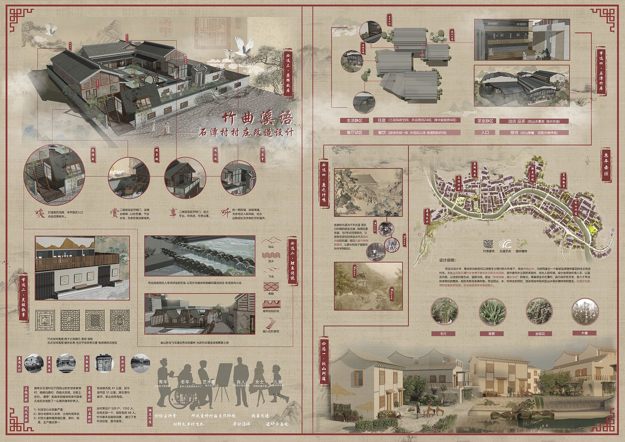 设计作品整体的功能定位以消费主义横行的大环境下,结合传统山水,为居民建立一个能够追求精神富足的生态旅游村庄。文化上保留石潭村本身慢节奏和多元的文化风貌,提升建筑外立面的美观性,优化人居环境。设计由场地环境入手,以溪流为面,以改造对象为点,道路为线,提出“林中探幽,嬉水为乐”的概念。尊重原生态石潭村,进行保护性开发,使六个节点形成有机的整体,相互关联且各具特色。在达到山、水、村共生的同时,使该场地中缺失的山水场所精神得到复生,弘扬文化的同时带动旅游资源,为当地居民带来相应收入。
