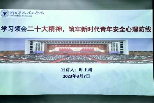 新学期新气象,为学习领会党的二十大精神,筑牢新时代青年安全心理防线,yl永利集团官网登录于3月7日晚在SB102开展“安全第一课”主题讲座。公司党委副书记、纪委书记叶卫树,思政辅导员沈浩东出席,讲座由沈浩东主持,全体大一员工参加本次讲座。