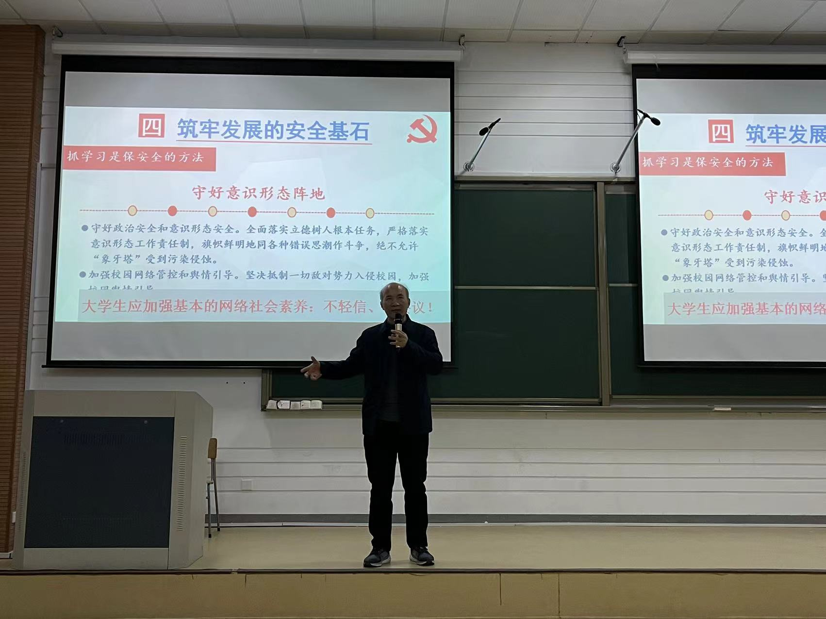 叶卫树以“学习领会党的二十大精神,筑牢新时代青年心理安全防线”为主题,以学习贯彻党的二十大思想为引领,围绕践行党的二十大精神、全方位牢筑校园安全意识等方面进行精彩演讲,引导同学们培养爱党爱国情怀、树立校园安全意识。结合老员工受骗案例和员工宿舍走访情况,叶卫树强调同学们要提高警惕、加固心理防线,注意寝室用电安全,养成良好的生活习惯,做新时代积极向上的好青年。最后,叶卫树高度肯定同学们在过去半年中的优异表现并与同学们进行亲切交流,勉励同学们在日后的学习生活中要继续学习领会党的二十大精神、贯彻执行党的二十大精神,使爱国主义教育、安全教育真正入脑入心。