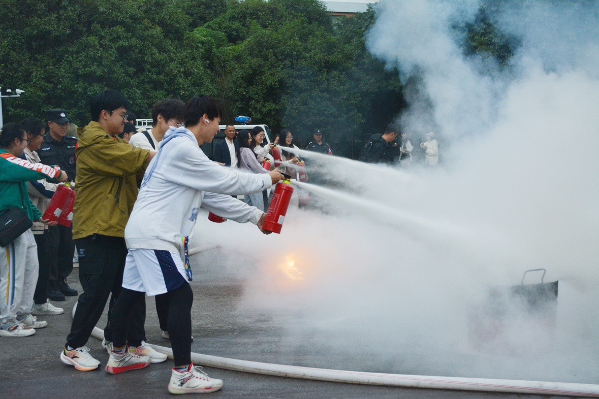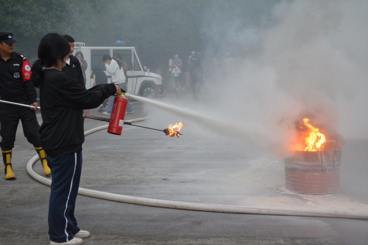 随后,现场师生踊跃参与,轮番上阵,操作灭火器多次将大火扑灭,消防实战技能得到检验。