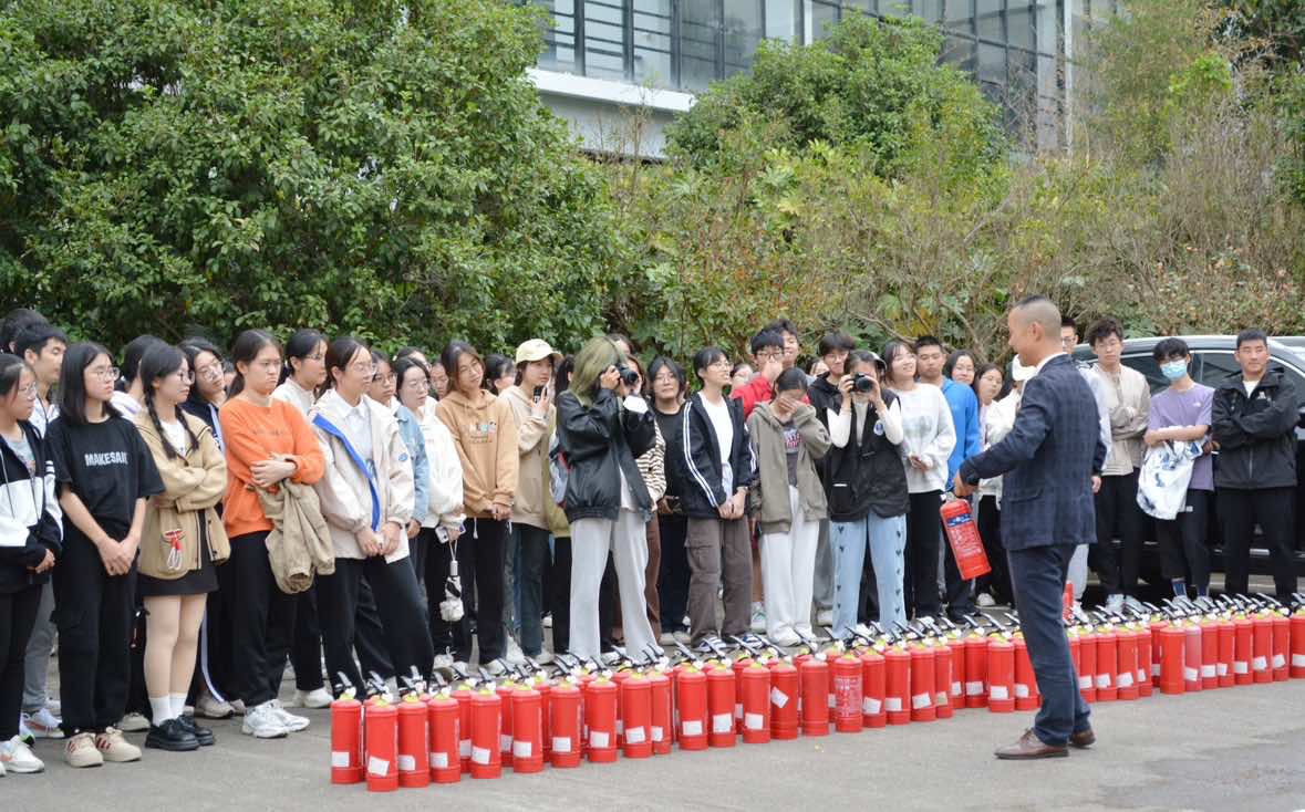 冯财杰为师生讲解了消防安全知识,介绍了干粉灭火器的使用方法,并现场点火,进行了实战灭火演示。