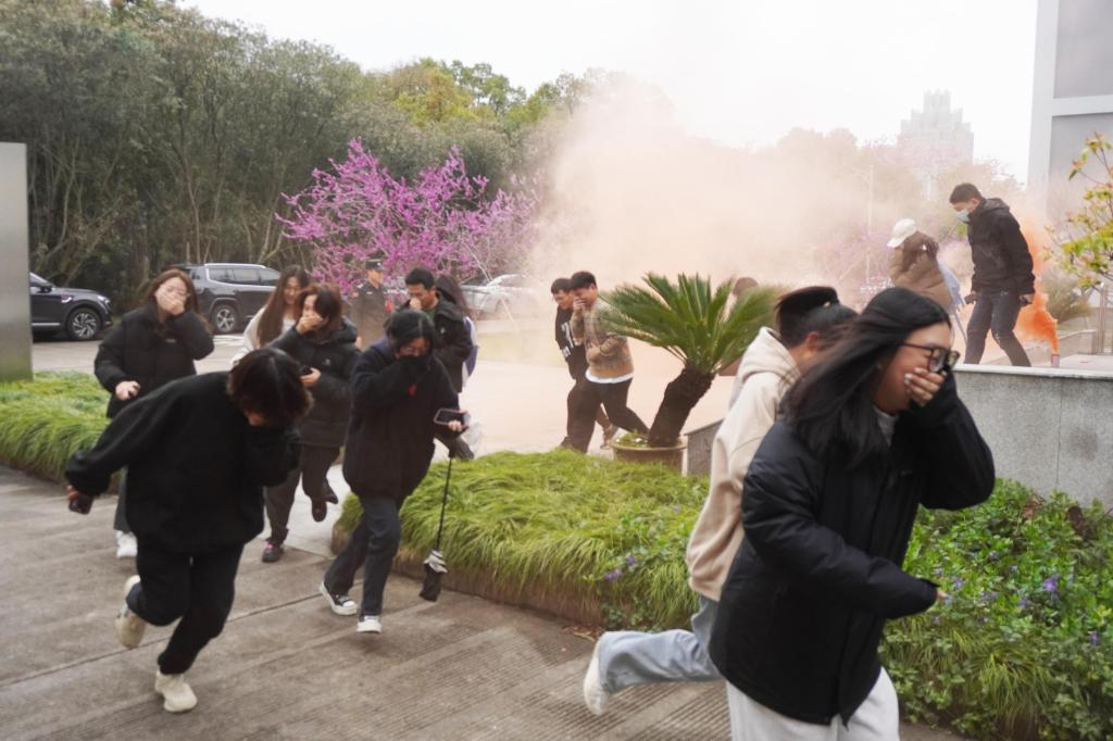 下午3点15分,随着消防警报响起,各位安全引导员迅速开始引导员工手捂着口、鼻,弯着腰,按照制定的疏散线路有序、安全地撤离教学楼,迅速到达指定地点集中。随后,各位老师立即清点人数,确保无一人遗漏。