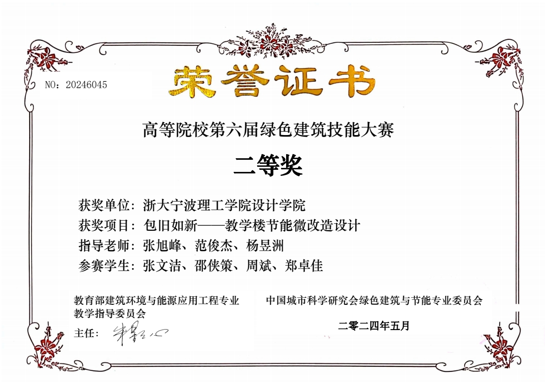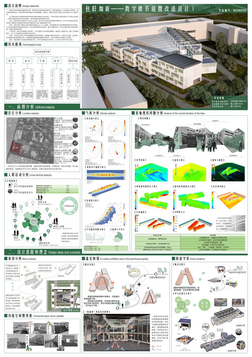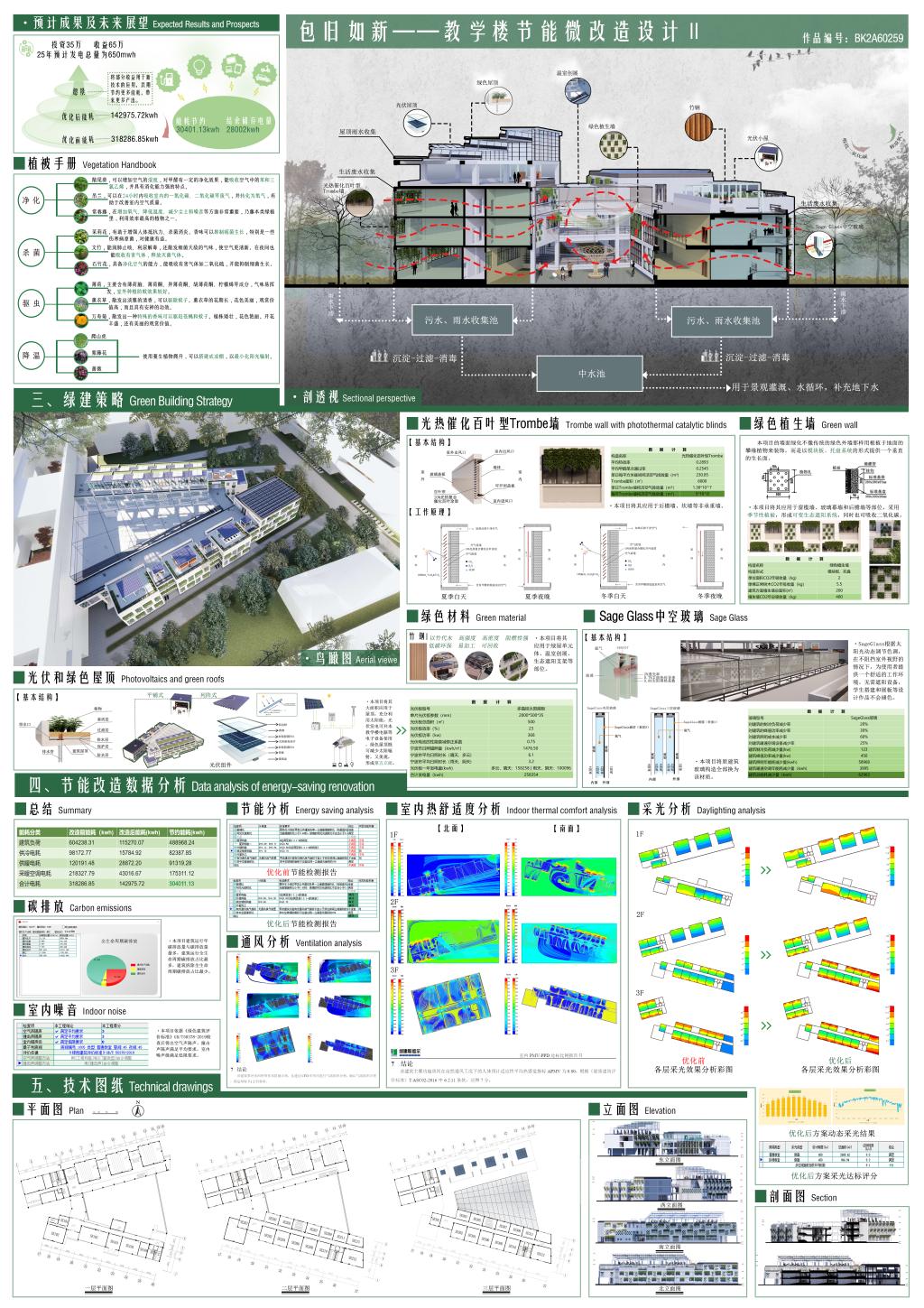由张旭峰、范俊杰、杨昱洲老师指导的张文洁、邵侠策、周斌、郑卓佳员工团队参赛作品《包旧如新——教学楼节能微改造设计》喜获二等奖。作品设计中应用光热催化型百叶Trombe墙、Sage Glass中空玻璃、绿色植生墙等技术,不仅提升了能源效率,而且美化了外观。此外,增设了温室创展和绿意学舍,为员工创造了一个自然的交流展示空间。
