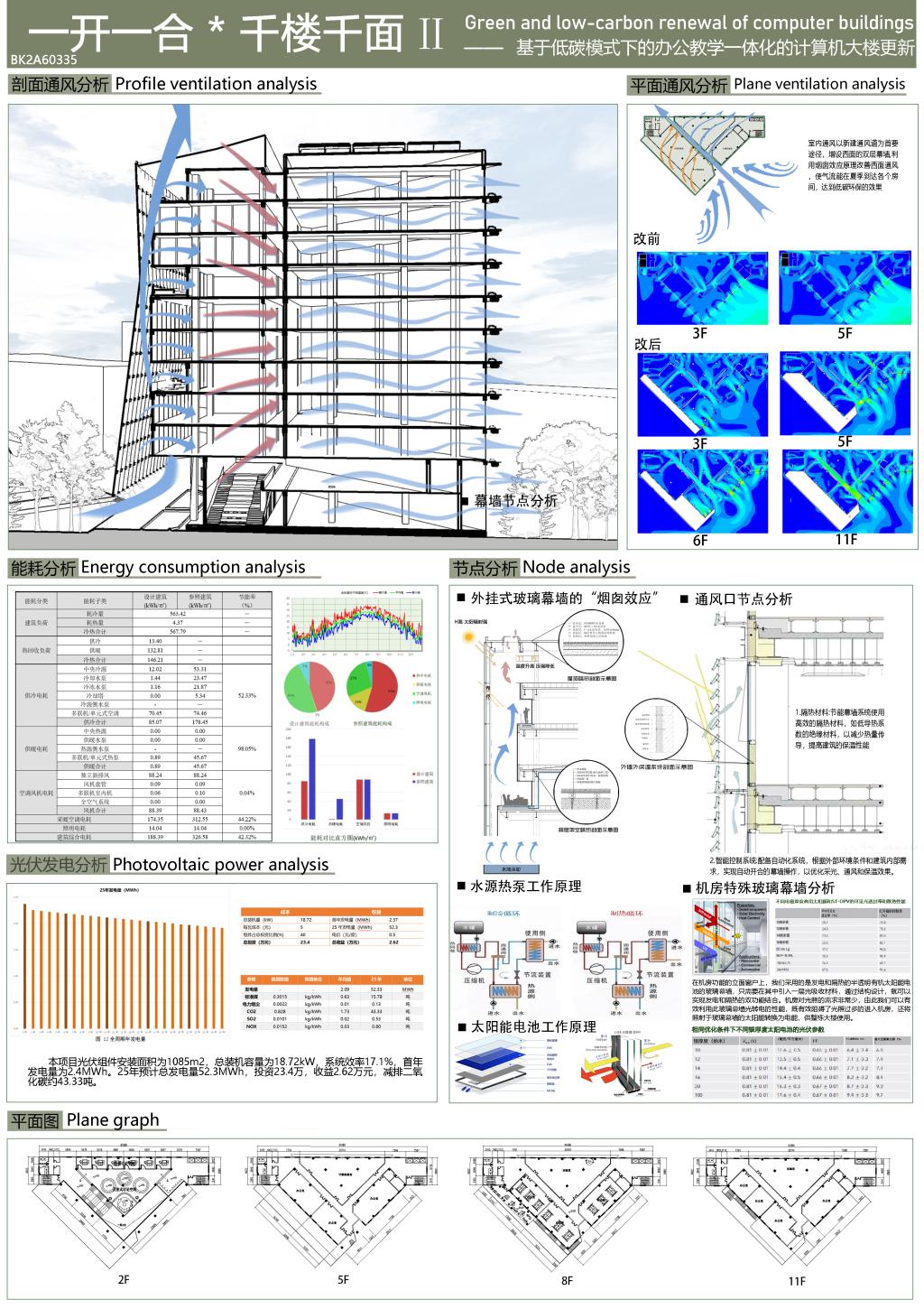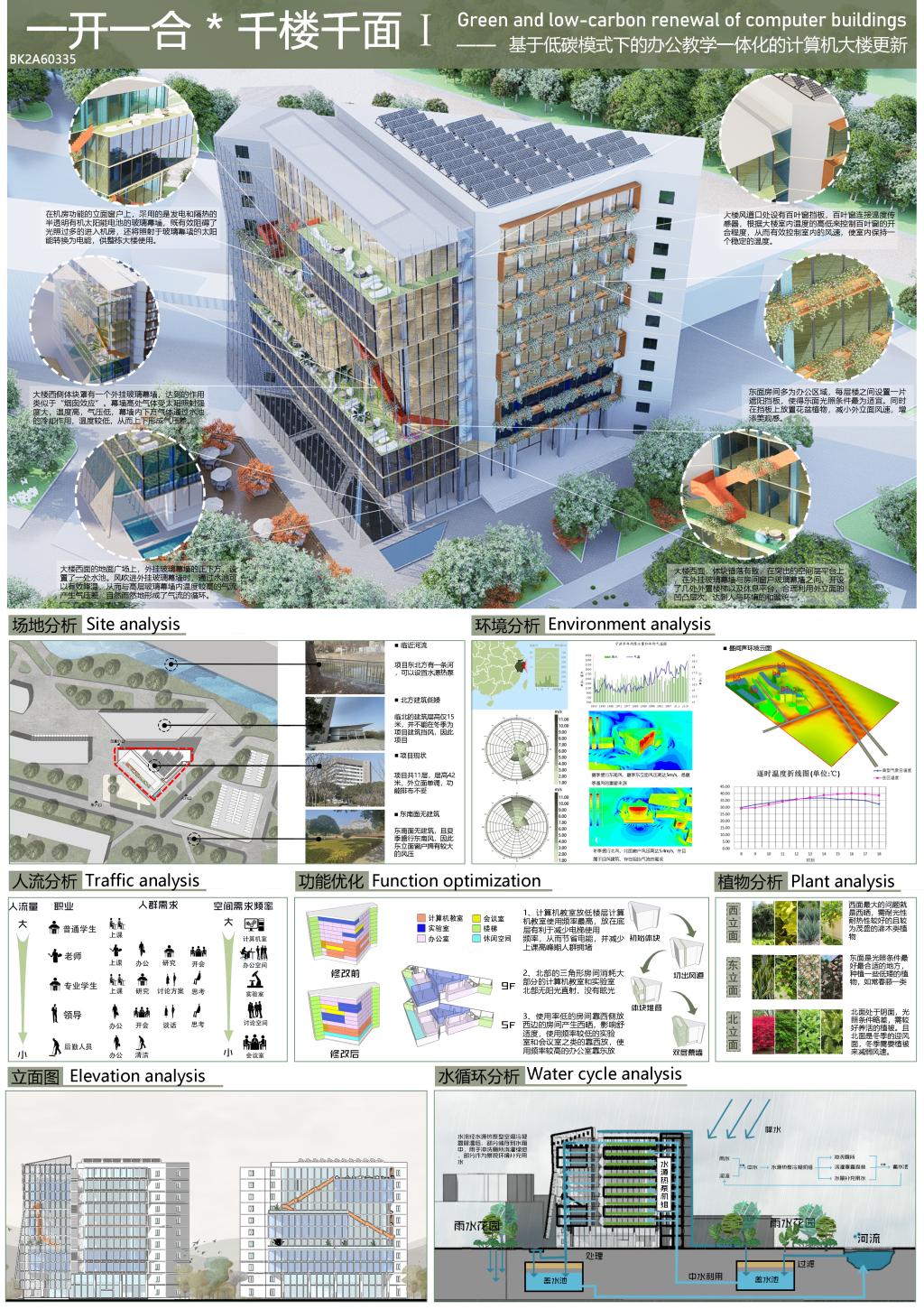 由张旭峰、毛鹏老师指导的朱予赫、张宏杰、张毅炜、魏千越员工团队参赛作品《生、息》喜获三等奖。该作品为办公教学一体化的计算机大楼设计,重点解决了散热和通风问题。设计采用风道、双层玻璃幕墙、植物遮阳和光伏玻璃膜,实现了自然通风、遮阳和低碳环保。根据不同房间功能,创造多样的立面风格。西侧教室和实验室外伸,形成休闲平台,增加光照面积,同时丰富外立面。通过低碳更新,大楼在外观和环保方面都取得了显著改善。