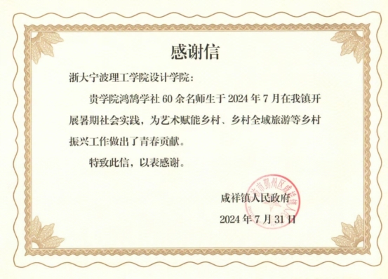 2024年7月,咸祥镇人民政府对公司在该地开展的暑期社会实践表达了感谢,在yl永利集团官网登录鸿鹄学社60余名师生的共同努力下,为艺术赋能乡村,乡村全域旅游等工作方面添砖加瓦,为乡镇的文化传承与经济发展提供青春活力,推动了乡村振兴工作的展开。