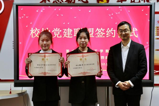 烈士陵园被授予青春红匠研学实践基地,陈志斌向数字媒体艺术201班叶含瑜、数字媒体艺术212班杨颖颁发宁波樟村四明山革命烈士陵园服务中心讲解员聘书。叶卫树表示公司将充分发挥在教学资源、理论研究、员工资源等方面的优势,为烈士陵园提供理论指导、政策咨询、艺术宣传等方面的资源和画作修复的技术支持,实现深度共建。